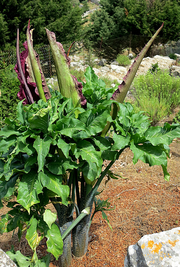 No problem in spotting some things. You would have to be both ocularly and olfactorily challenged to miss the Dragon Arums which are still in flower though not as widespread or profuse as a few weeks ago.