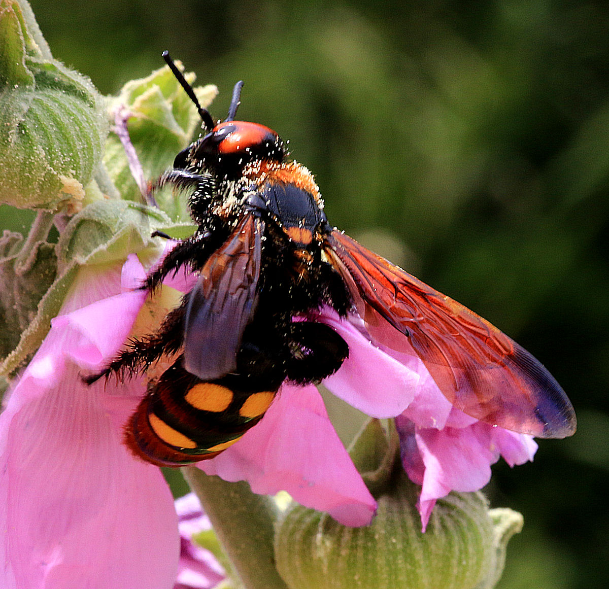 Black and yellow warning markings with a body length the diameter of the wild hollyhock flowers it pollinates