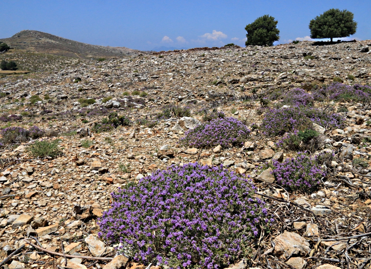 When I arrived back at the beginning of June from a brief stay in Grey Britain, the oregano had mostly turned dull brown as seed has set. Now the vivid blue of thyme is dominant. This isn’t the soft-stemmed thyme I grow in the herb garden at home but a tough prickly variety which deters the voracious appetite of the goats and seems to have no other predators.