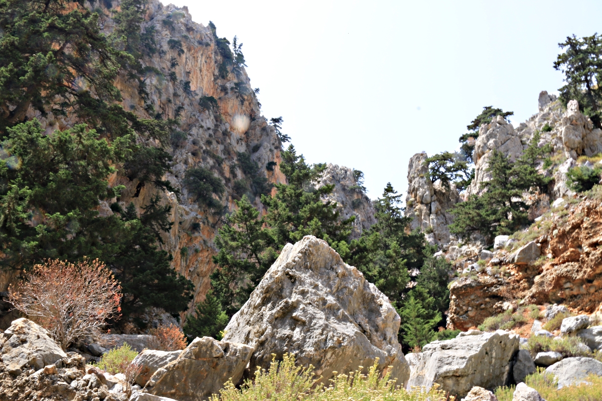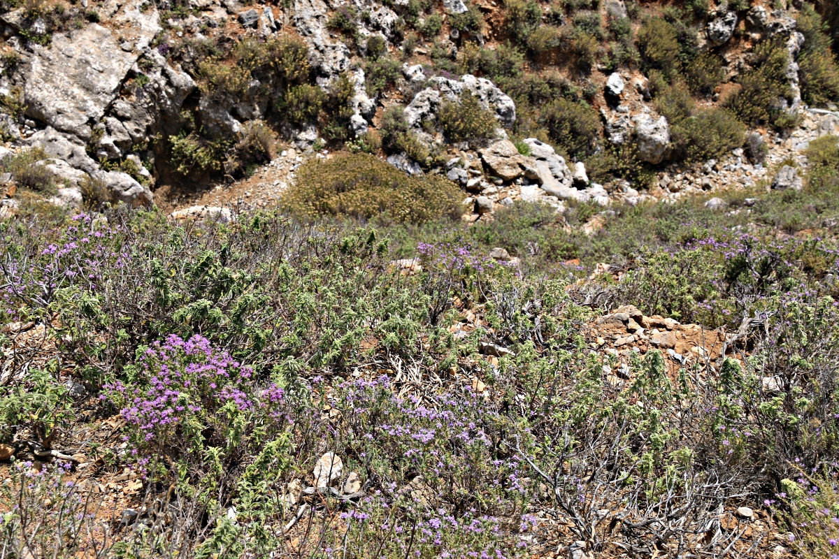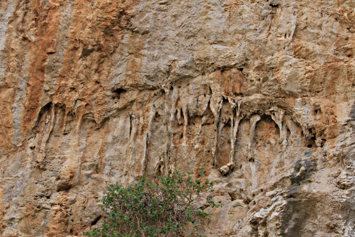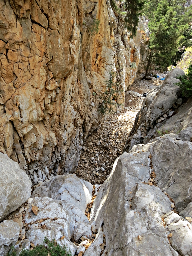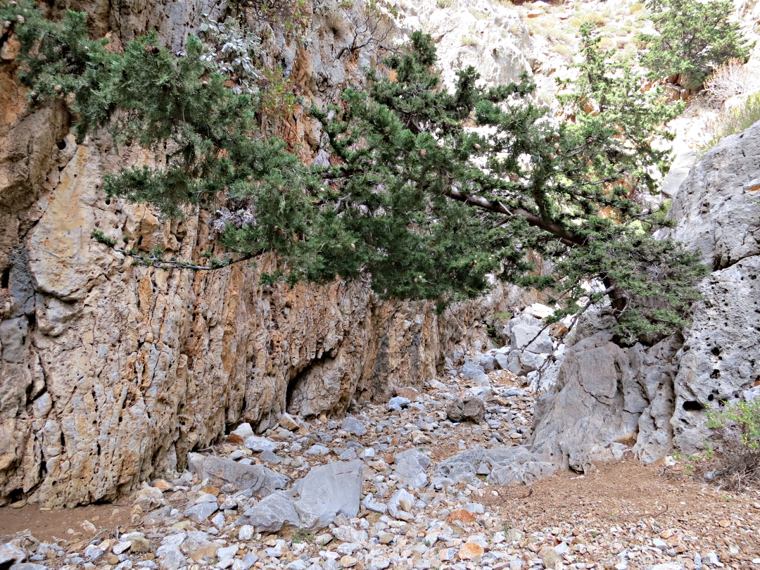 The outward trek was enjoyable as always, first on a good kalderimi to the burgeoning hamlet of  Ksissos on the ridge and then on a great path high above the floor of the gorge with occasional glimpses of the dry riverbed which I would soon be following far below.  Closer to the coast the cliffs dropping into the gorge become more and more dramatic with natural ‘bonzai’ cypress trees clinging to fissures in the rock.  The moment when the beach first comes into view still causes an intake of breath.  The final steep descent on near vertical rock is usually the most interesting part of the walk but this time it was just a warm-up.