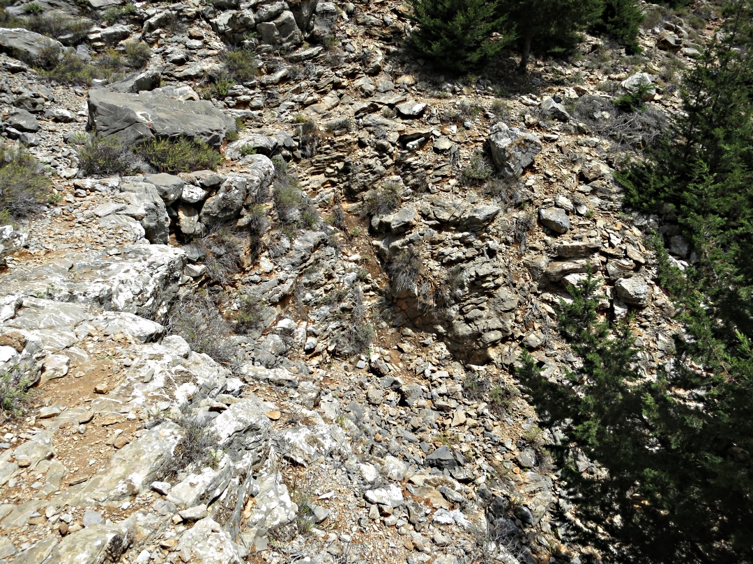 As I get deeper into the gorge, goats panic and rush upwards sending a shower of rocks crashing down, a reminder to stay away from the sides where possible.  Much of the gorge walls are solid limestone but in places are sections of loose, unconsolidated conglomerate with much evidence of recent substantial rock falls.