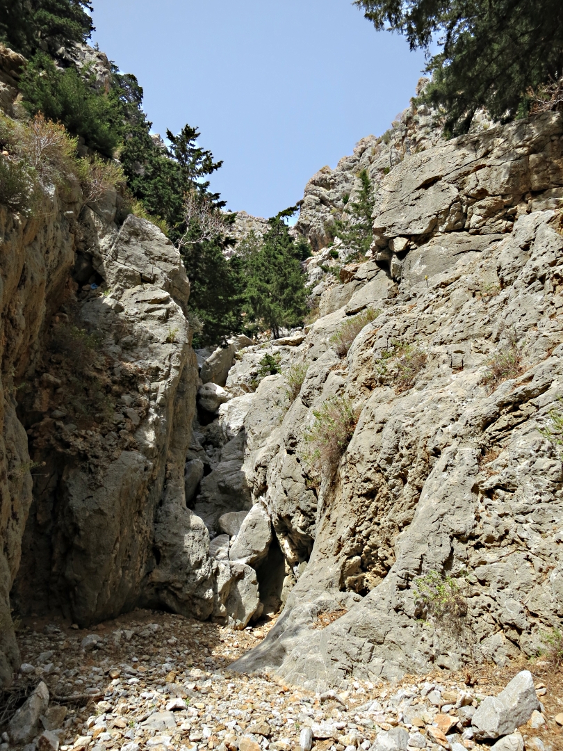 I didn’t know if it would be possible, I remembered following the bed of a gorge at Olymbos on Karpathos and coming across a waterfall which I would have struggled to climb even with rock boots, a rope and a climbing partner.