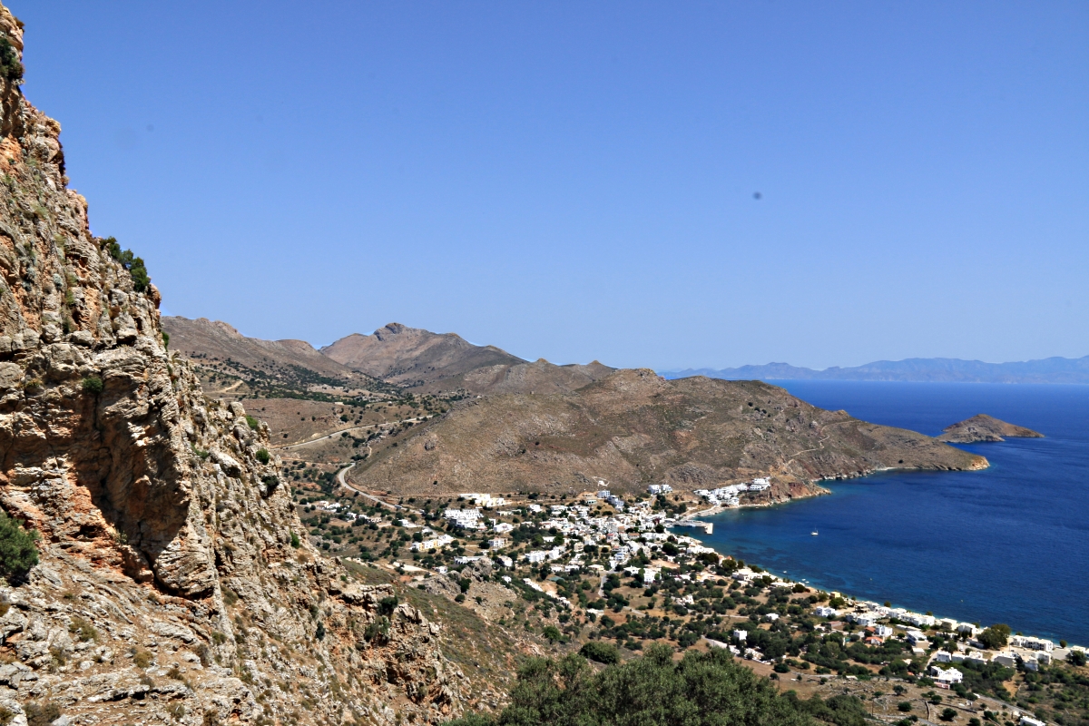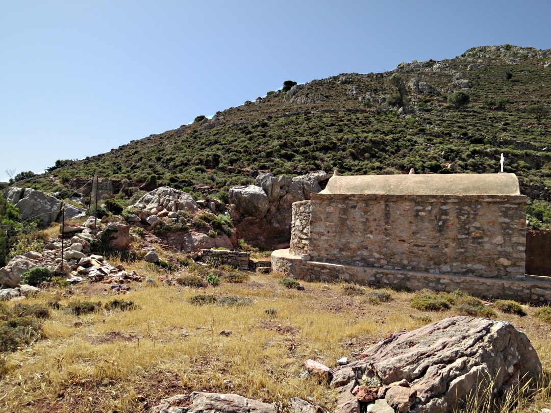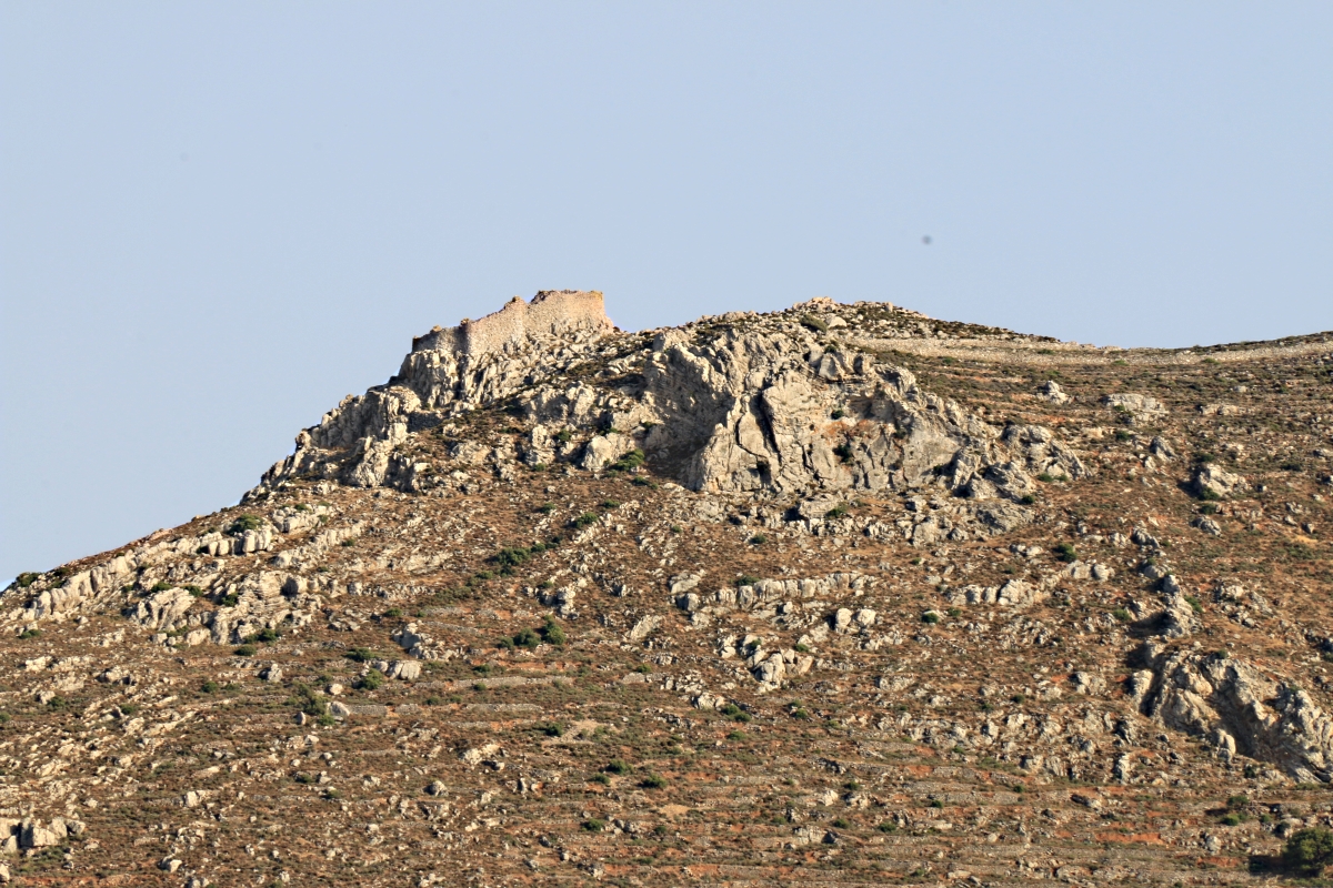 There is a very good, easy path climbing up to the ridge from part-way along the seafront road in Livadia, crossing over the ridge-line tarmac to a brilliant path down to the beach. A very good and enjoyable walk. I decided instead to walk up to Agia Anna, a small whitewashed chapel on a shoulder half way up the mountain and then take a narrow path up to Agriosikia Castle on a strategic prominence overlooking the whole bay.