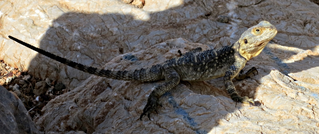 Though there is no shade tree at Agia Anna there is shade from the building and after a slurp of iced water it’s onto a narrow path winding gradually up towards a gully and then more steeply up at the foot of high crags to a fenced enclosure at a spring at the head of a gully .