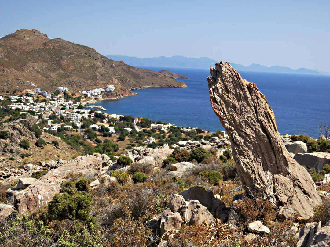 Soooo, I decided that the best approach was to head for a beach via a route which would be more of a challenge. The primary contenders were Tholos and Stavros, both on the other side of the island. Unfortunately the construction of a tarmac road up to and along the ridge to access the island’s waste disposal facility has provide access to the top of the paths down to both beaches and nerds who hire scooters and drive up there think that the motorway-style signs to Tholos point to a vehicular route. Wrong!!! I haven’t seen this myself but was told in the taverna the evening before that a group of eight people, four male and four female, were seen walking topless along the top section of the Tholos path before it drops steeply and things get very rocky. Very Rocky. My interlocutors had gravel-grazed eyeballs so I know that the topless bit was true.