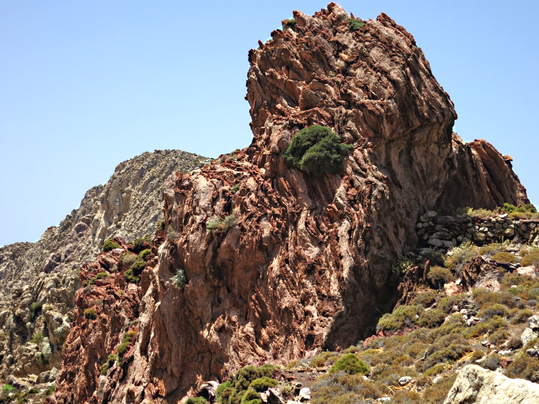 The descent to Tholos beach is 200 metres, first gradually on a well-trodden path and then a drop down a dry stream bed with wildly contorted folds of rock which must have been created by random but immense pressure, like crushing an empty 1½ litre water bottle with your hands from both ends and then screwing on the cap. A new section of path has been forged to by-pass a small, dry waterfall which I followed on the way down but chose the old path on the way back and climb the fall.