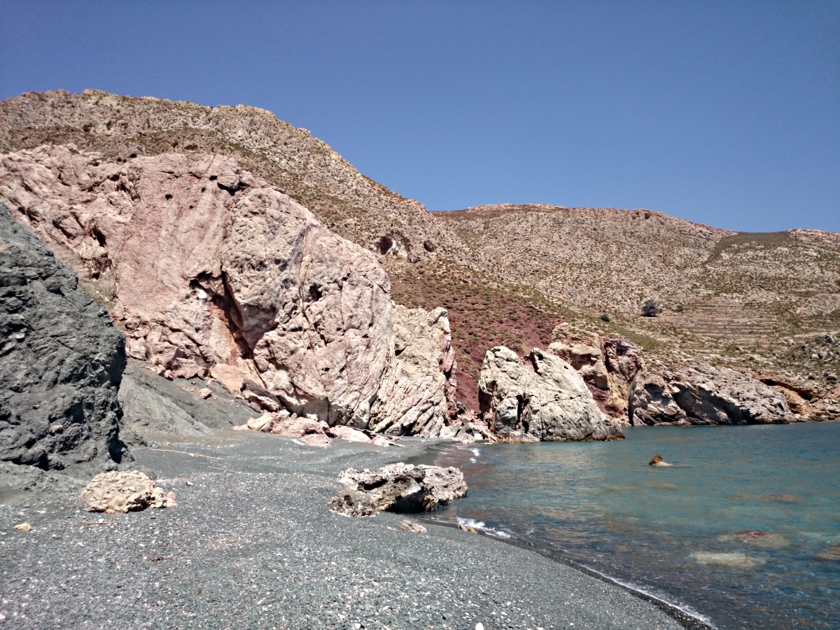 Though I set out with that specific intention, I didn’t get to have a swim on the day that The Mountain Destroyed My Sandals. I passed the top of the path down to Depsoti To Nero on my way back but reasoned that a 120 metre descent to the beach would be inevitably, as sure as shit follows fart (the speed at which it does so is directly proportional to age,…. or so I’m told), followed by a 120 metre climb back up . True, I could have replenished my water supply from the spring but my feet hurt because my sandals had died and I had by then been walking for 6 hours under cloudless sky with very little shade and the attraction of a cold beer under the bougainvillea at Agios Stephanos outweighed the urge to get wet.
