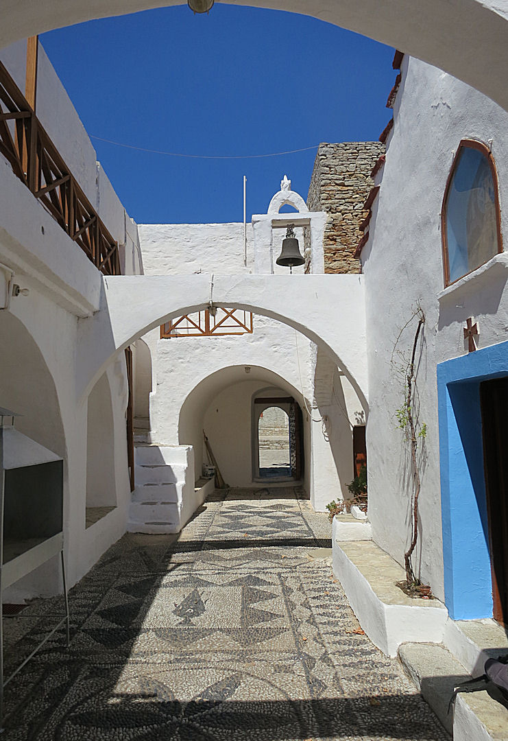 From the ridge-top I dropped down to the path and back to Megalo Sotiros monastery. Usually the enclosure is locked. On one occasion earlier this year it was open as was the entrance to the courtyard but a priest was making his tea and expelled us very grumpily. On this occasion it was open and the guy who was doing the maintenance/cleaning not only welcomed me in but unlocked the door to the church with its impressive Hochlakos-mosaic floor and well preserved frescos said to date back to 1727. The fine craftsmanship of the wood carving of the iconastis includes repeated detail of vine leaves and bunches of grapes decorated with (what I think is) gold-leaf, an indication of the wealth once derived from wine production in the area.