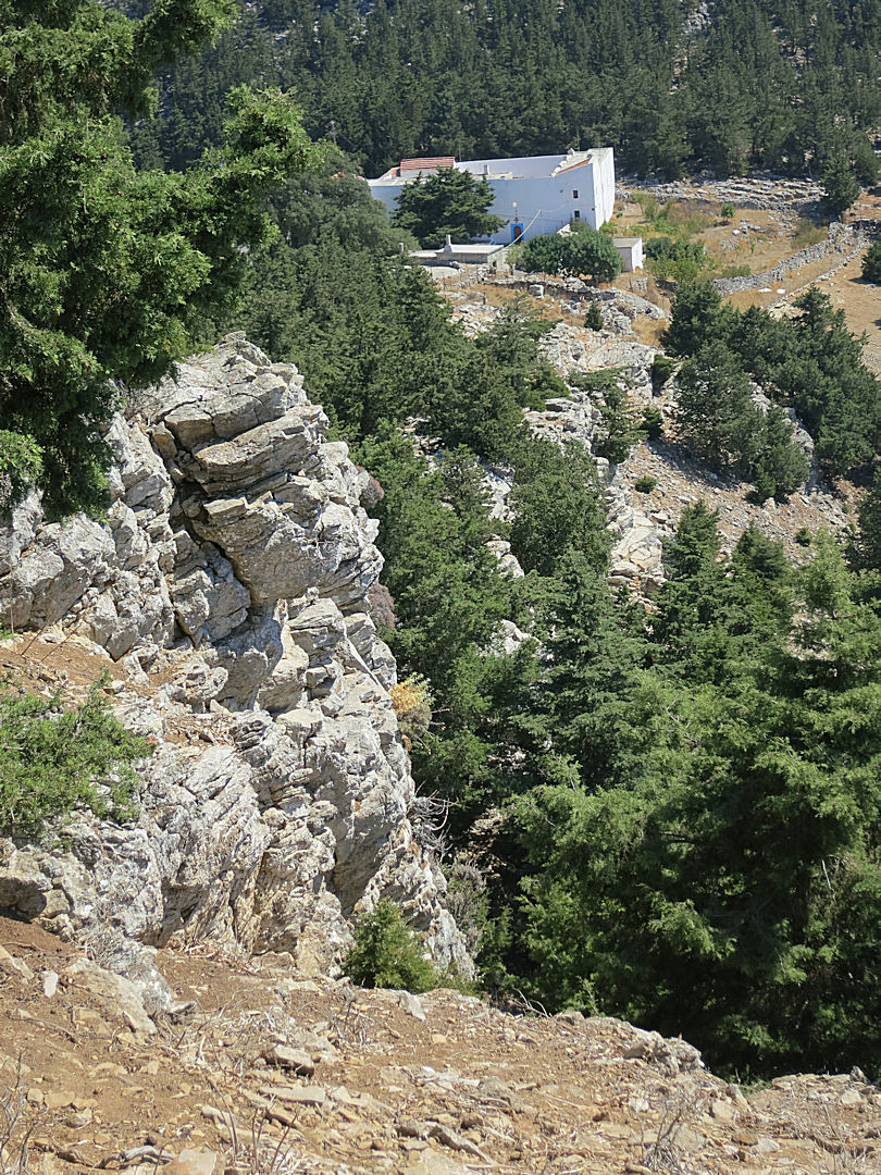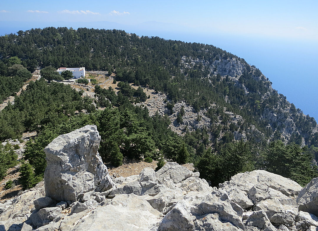 What I did this time was to wander higher up behind the restored wine-presses beyond the flat slabs of rock to more broken limestone to the reach the top of the ridge looking down to the coast and the Panormitis monastery.