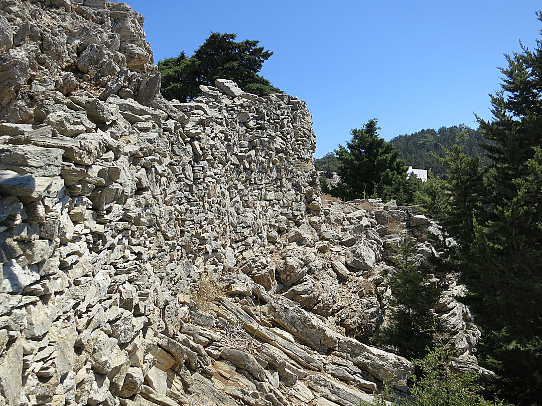 One day I trekked up to the main ridge to visit the Byzantine stone wine presses in the Kourkouniotis area of the island. With close to 2000 feet of height gain much of the route is difficult walking over very rough, rocky ground but the landscape is dramatic and the whole route very satisfying. Eventually it reaches The Tarmac, the ridge-top road and, though sections of it can be by-passed, there is necessarily a short walk along it to the fortress-like Megalos Sotiris monastery and the start of the very good, easy-gradient path to the wine-presses.