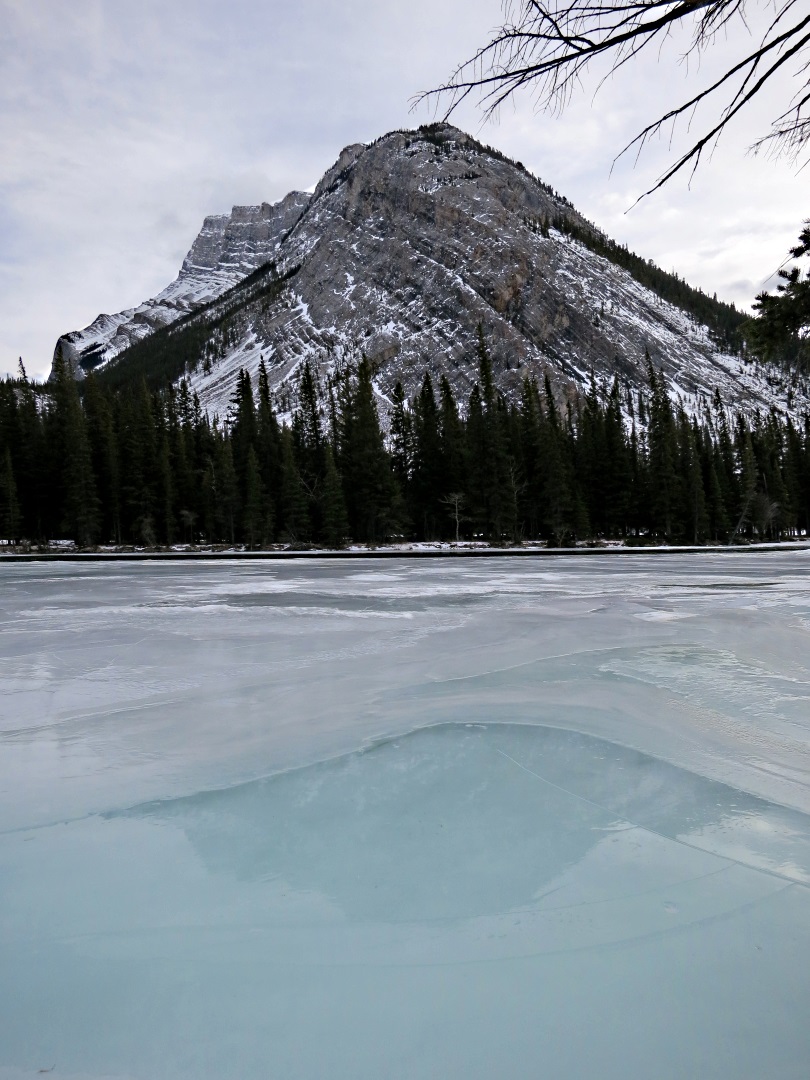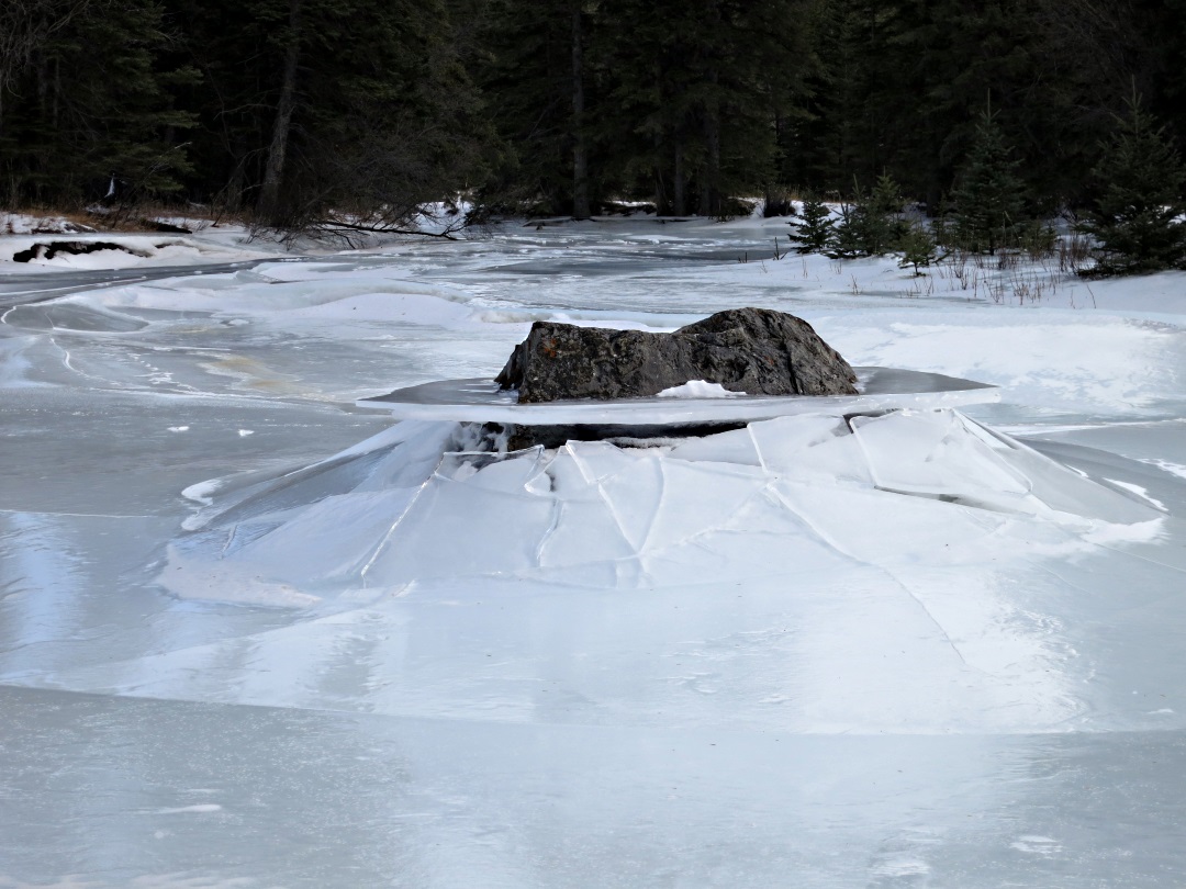 Soon afterwards I turned off onto Tunnel Mountain Drive. Classed as a ‘scenic route’ it’s closed to traffic in winter. It soon becomes apparent why. Apart from the amount of snow on it there has obviously been a flow of water across it in various places from the crags on the uphill side which has frozen into sheets of thick glassy ice, slippery (‘slick’ as they say in Canada) to walk on, impossible to drive on.