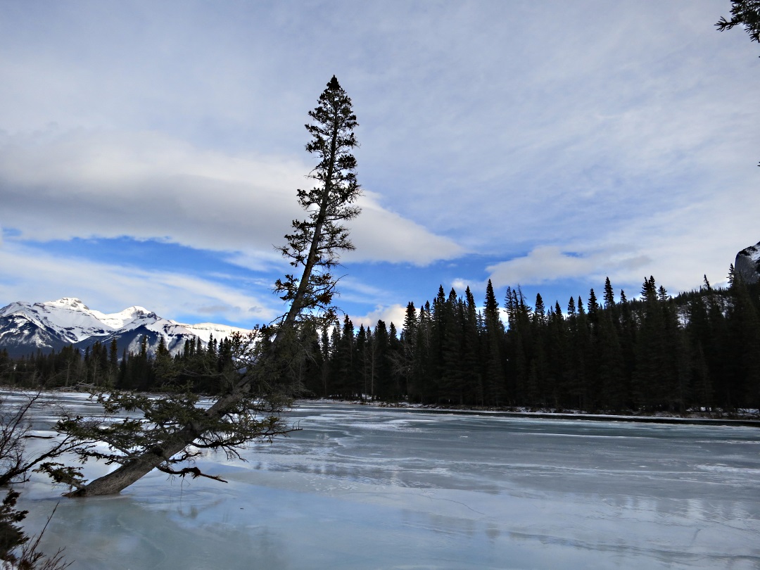 The river flows from the Bow Glacier and the Wapta Icefield, the melt-water giving the ice a pale green tinge in places, the fine Alberta snow blown off by strong winds. There is still a narrow open flow of water close to the opposite bank and with widespread signs of collapsed ice I don’t trust it to walk on.