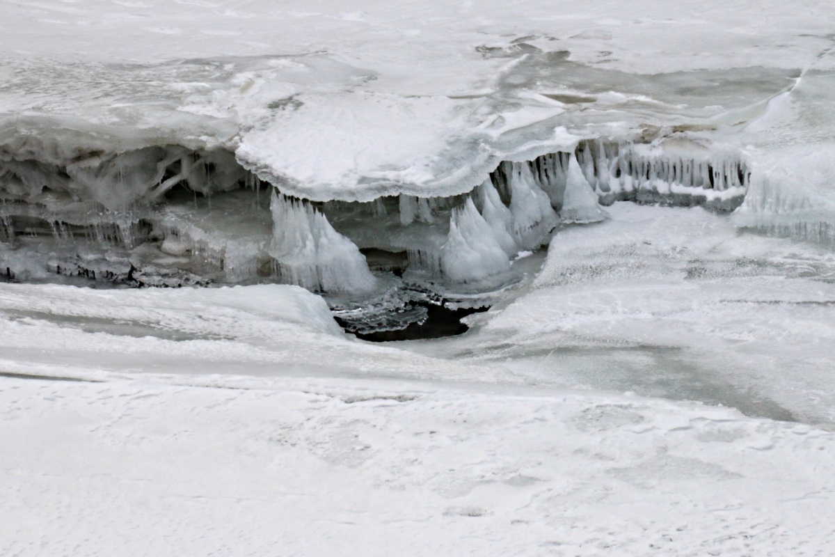 The first part of the route is on the Bow River Trail to Surprise Corner Viewpoint high above Bow Falls. Initially a surfaced footpath passing large expensive riverside houses, the trail soon leaves the built-up area, climbing steps to go along the road but with cleats over my boots I preferred to walk along the edge of the cliff looking down on the fractured ice as the flow accelerates towards the falls. The river had frozen earlier in the winter but when it warmed up to just a few degrees below zero, the ice had collapsed as the water level dropped, refreezing as temperatures dropped again.