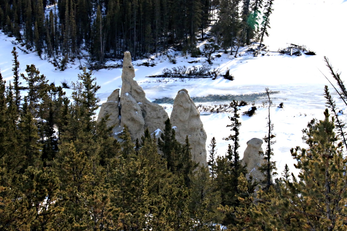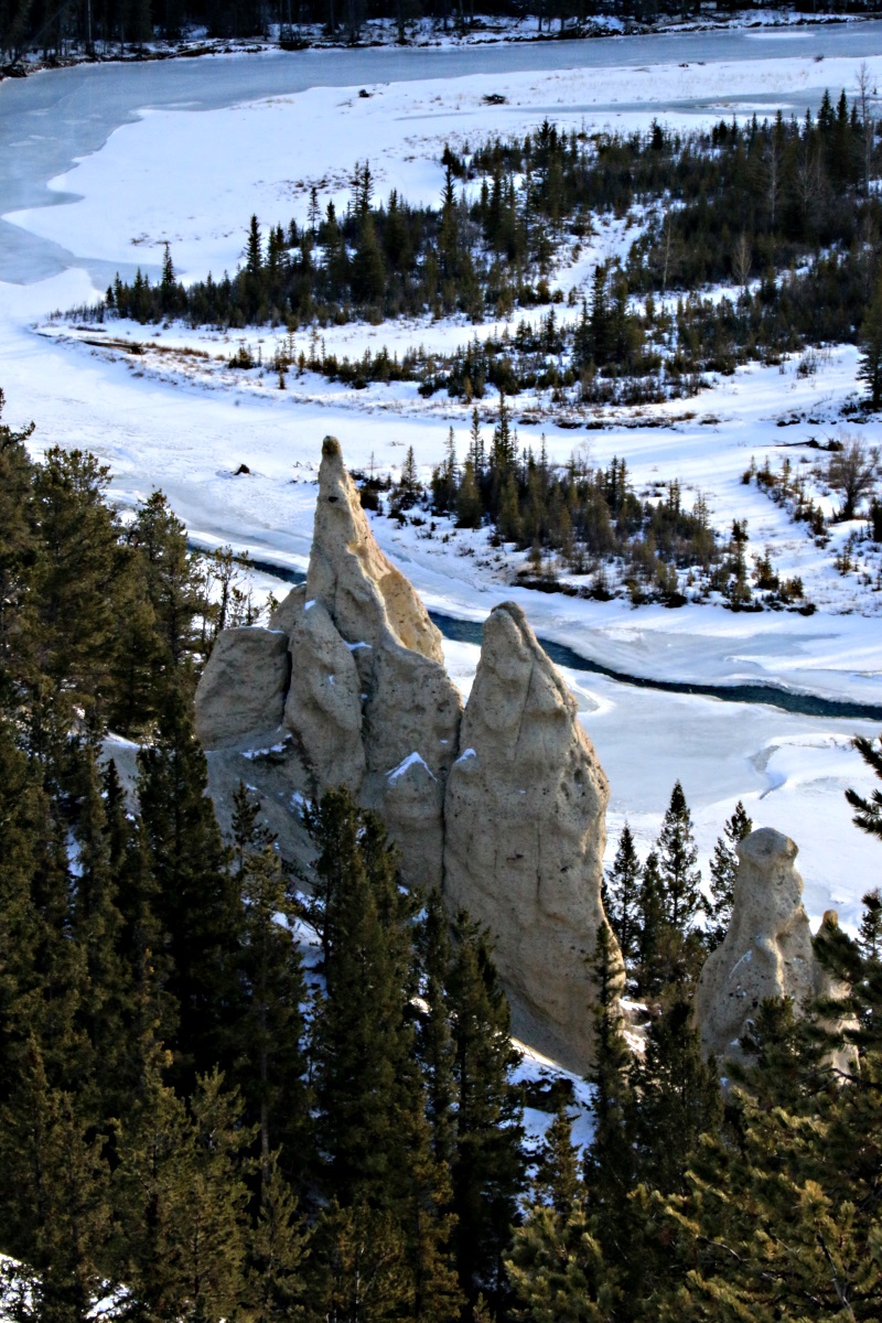 Almost at the end of my stay in Canada, on the last of my days off from skiing, I set out to trek along the Bow River to the Hoodoos, thin pinnacles eroded in soft sedimentary rock.