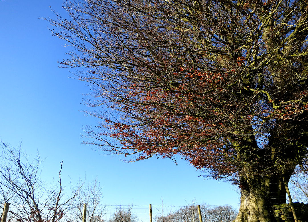 On way up to the top of the ridge a beech tree still clings onto its autumn leaves despite the wind
