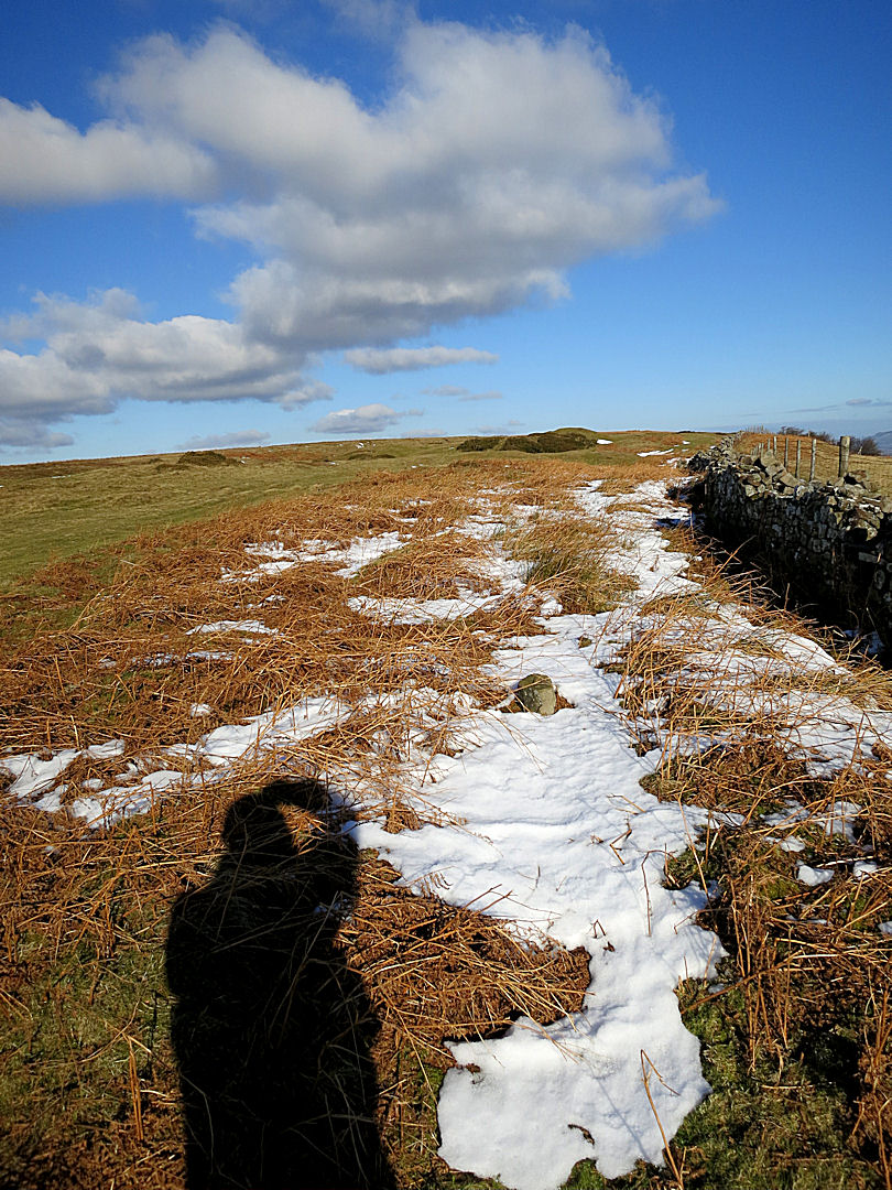 The result was a ridge-top with little snow still left but frozen hard, standing water from previous heavy rainfall with a crust of ice.  Snow persisted on east and north facing slopes and in the lee of stone walls but elsewhere the small amount which had fallen having been whipped off by strong winds.
