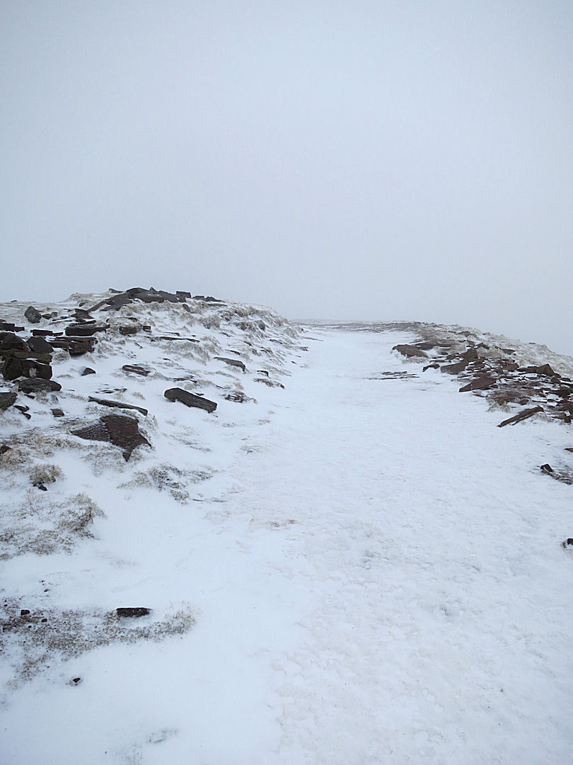 On the way up the sky was clear at first, Corn Du, the nearest of the two peaks at the top of the path, in sharp view. Then cloud drifted over shrouding it and the temperature seemed to drop even more. In the col exactly 2 miles and 52 minutes from the car park, the venturi effect accelerated the wind to ‘lean-on’ strength, the chill factor dropping the temperature to below -10 oC. It was now cold enough to stop the battery in the camera from working, requiring a battery change with numb fingers .