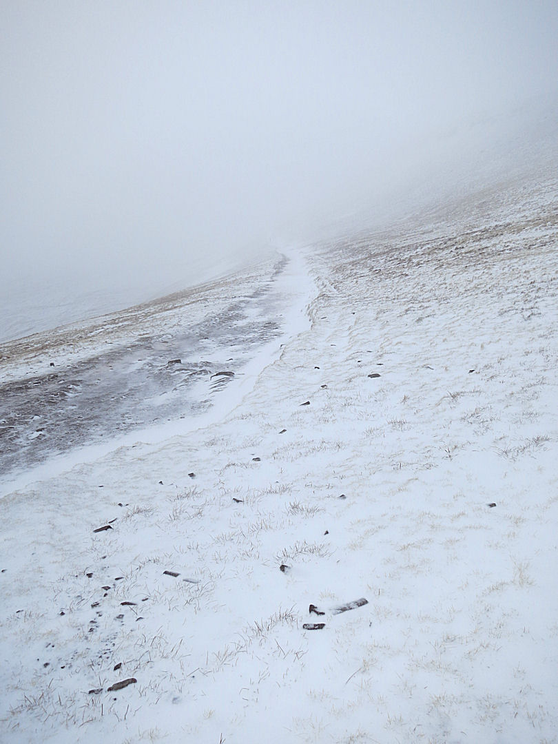 As I stood there, cooling off rapidly after the climb, I reflected on the number of times I climbed Cadair Idris in Snowdonia in even more extreme winter conditions. The stone construction on the top of that mountain is a climbers’ hut, offering brief and very welcome respite from the wind and snow. The conical construction on Pen-y-Fan offers no shelter from the wind which simply wraps around it, again the venturi effect accelerating its speed. The fine snow was swirled off the top which was almost bare.