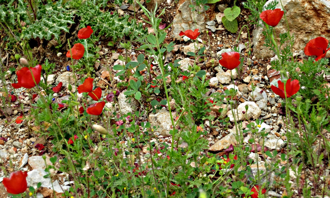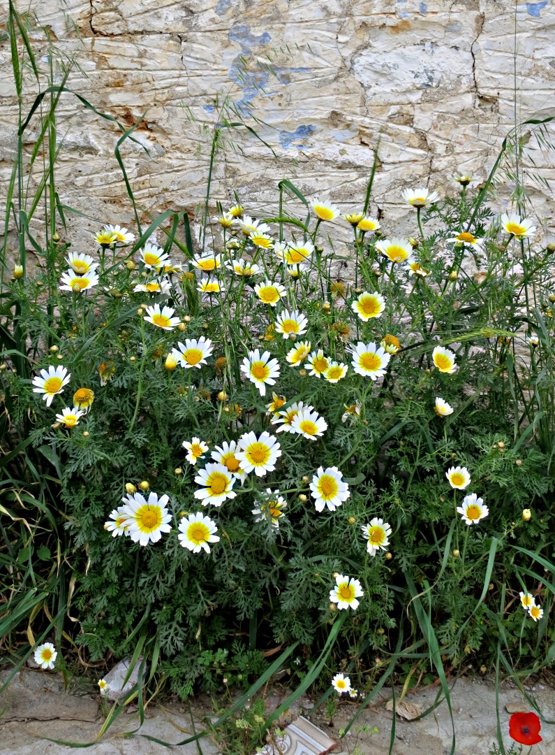 Daisies of various kinds, but especially the flamboyant Crown Daisies, grow in clumps against walls, colour whole fields, with poppies adding an additional eye-catching splash of colour.