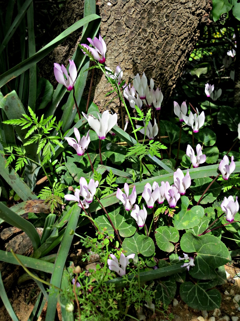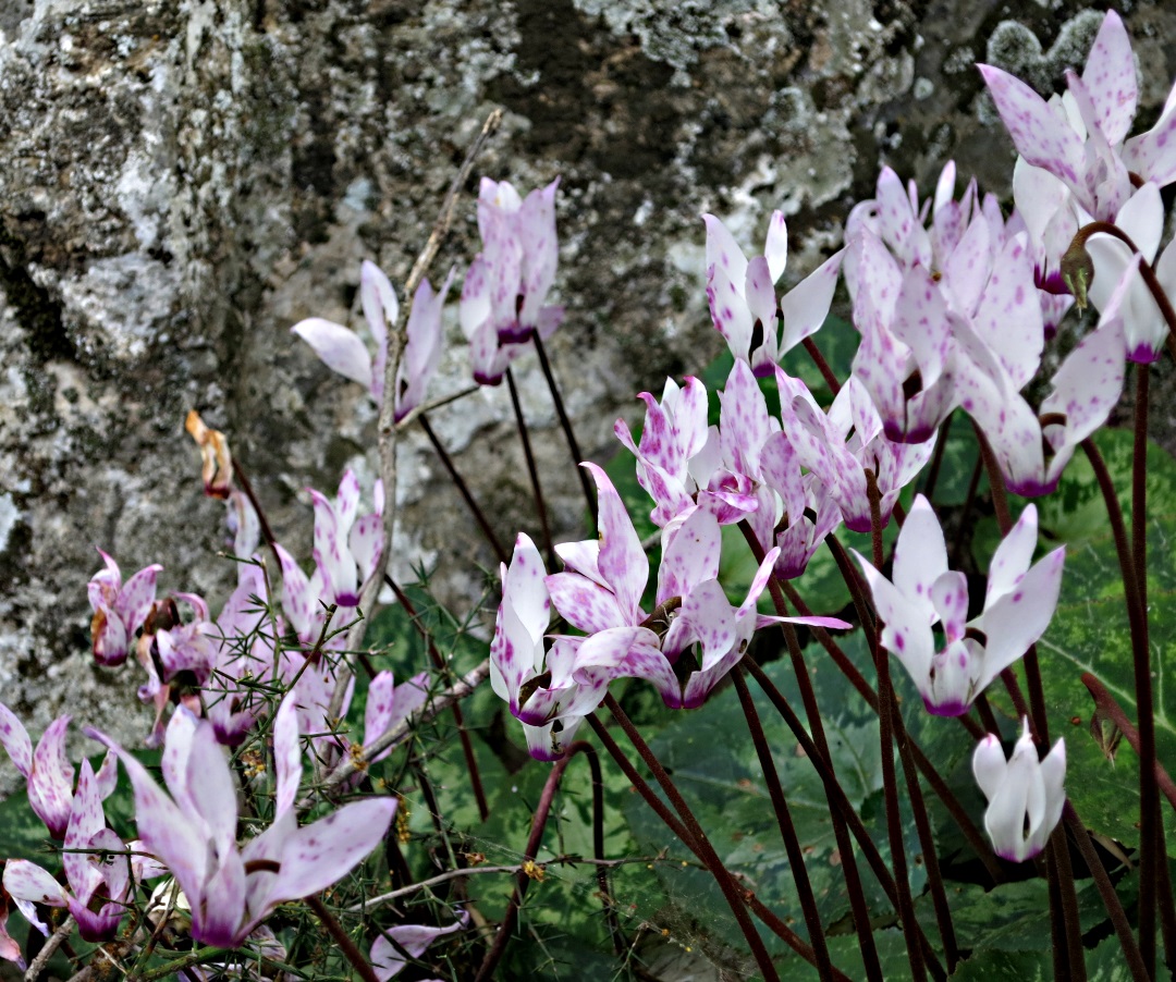 This time last year a walk down the path to Pedi was rewarded with a few scattered patches of cyclamen remaining in flower.  This year there are literally tens of thousands, carpeting shady ground underneath trees, clustered at the foot of stone walls, growing out of rock crevices.