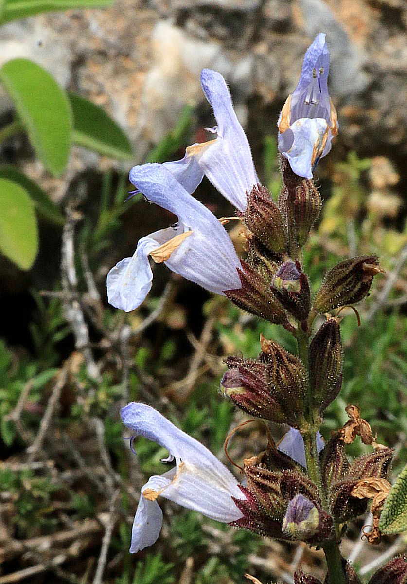 The narrow but very clear path flanks increasingly high above the Vasilios Gorge, the bed of which drops rapidly down. The mountainside here is covered in sage, at the end of April and early May in flower and buzzing with bees. Brush against it, as inevitably you must, and the air becomes fragrant. It is a characteristic of Symi that some mountainsides are covered in sage, others in oregano and others in thyme. The sage flowers earliest in spring, then the oregano and then towards the end of May and into June, the thyme. Some areas have both sage and oregano but mostly it is one or the other.
