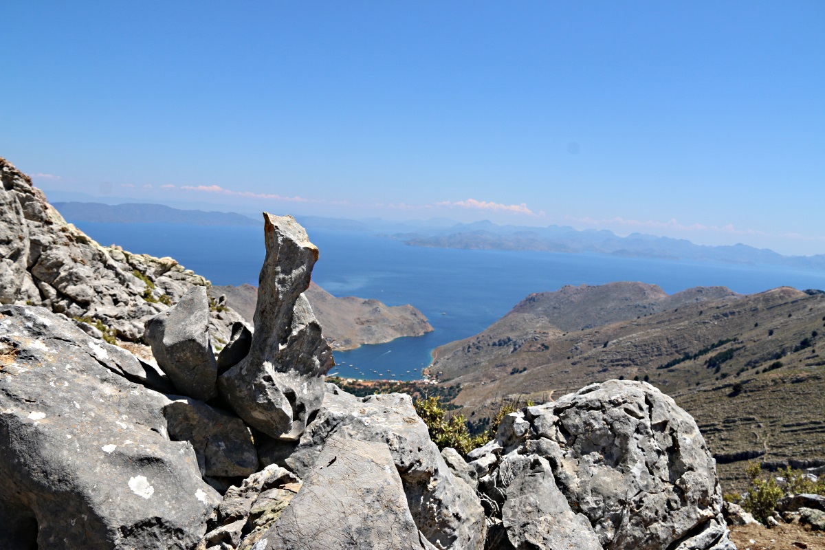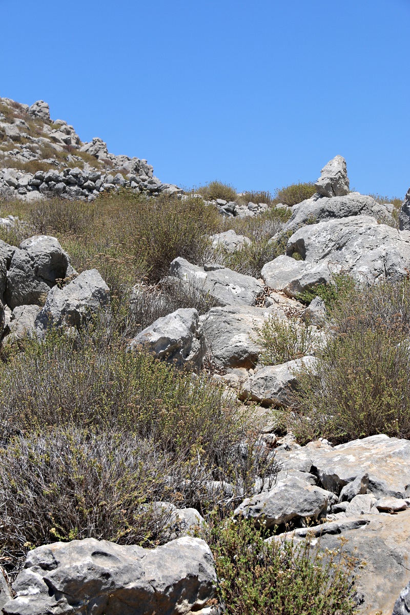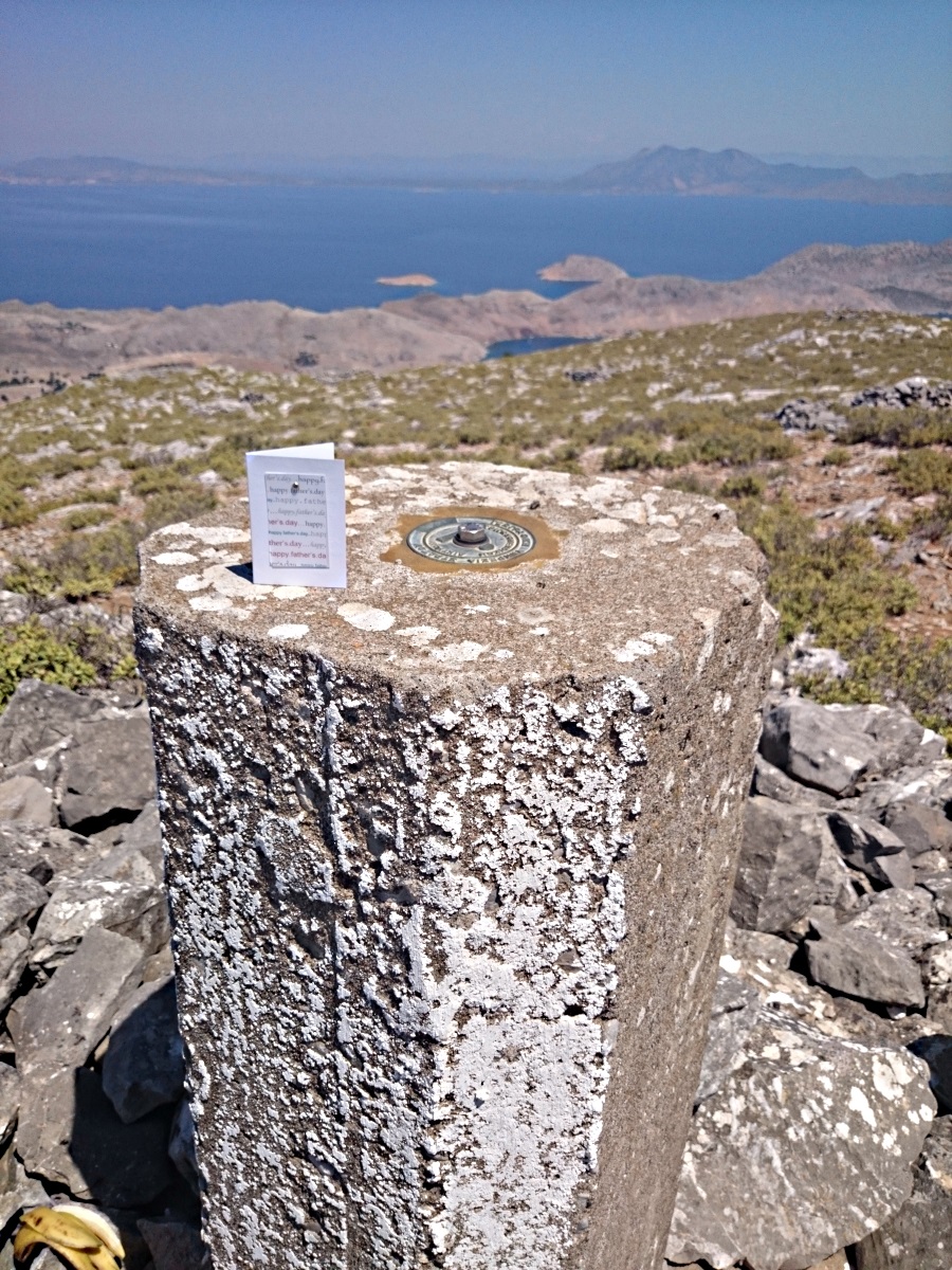 Sunday 21 June, the summer solstice, time to climb Oros Vigla, highest mountain on Symi. The summit is barely a mile from the house as the crow flies but I’m not a crow so the 500 metres height gain comes the hard way. Look up the Kali Strata from Lefteris’s Kafenion, pint in hand, and it’s there, straight above. In truth it’s a very modest mountain, 618 metres according to the SKAÏ map, a little less by the altimeter in my watch. But the direct approach, the ‘direttissima’, is challenging. No path, just up the terrain.