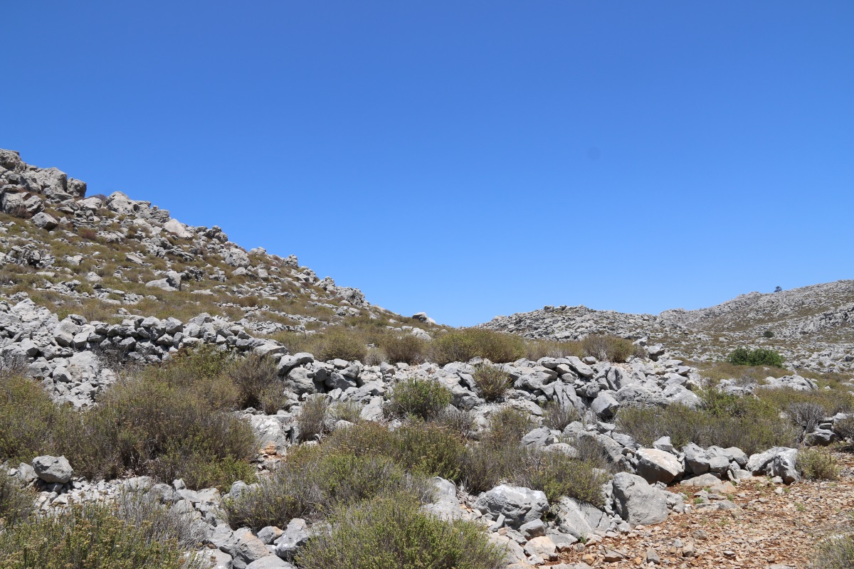 The route, first steeply up to Profitis Ilias monastery (amazingly not on the top of the mountain!) is initially frustrating, through a Greek gates made of an old metal bed fastened with bits of tatty rope, now rarely opened since a dirt road was bulldozed off the zigzag tarmac. Takes time and ingenuity to untie. The once well-made kalderimi to the monastery is overgrown and collapsing. Then another metal bed-gate similarly tied, to reach the top edge of the monastery and onto the open mountain.