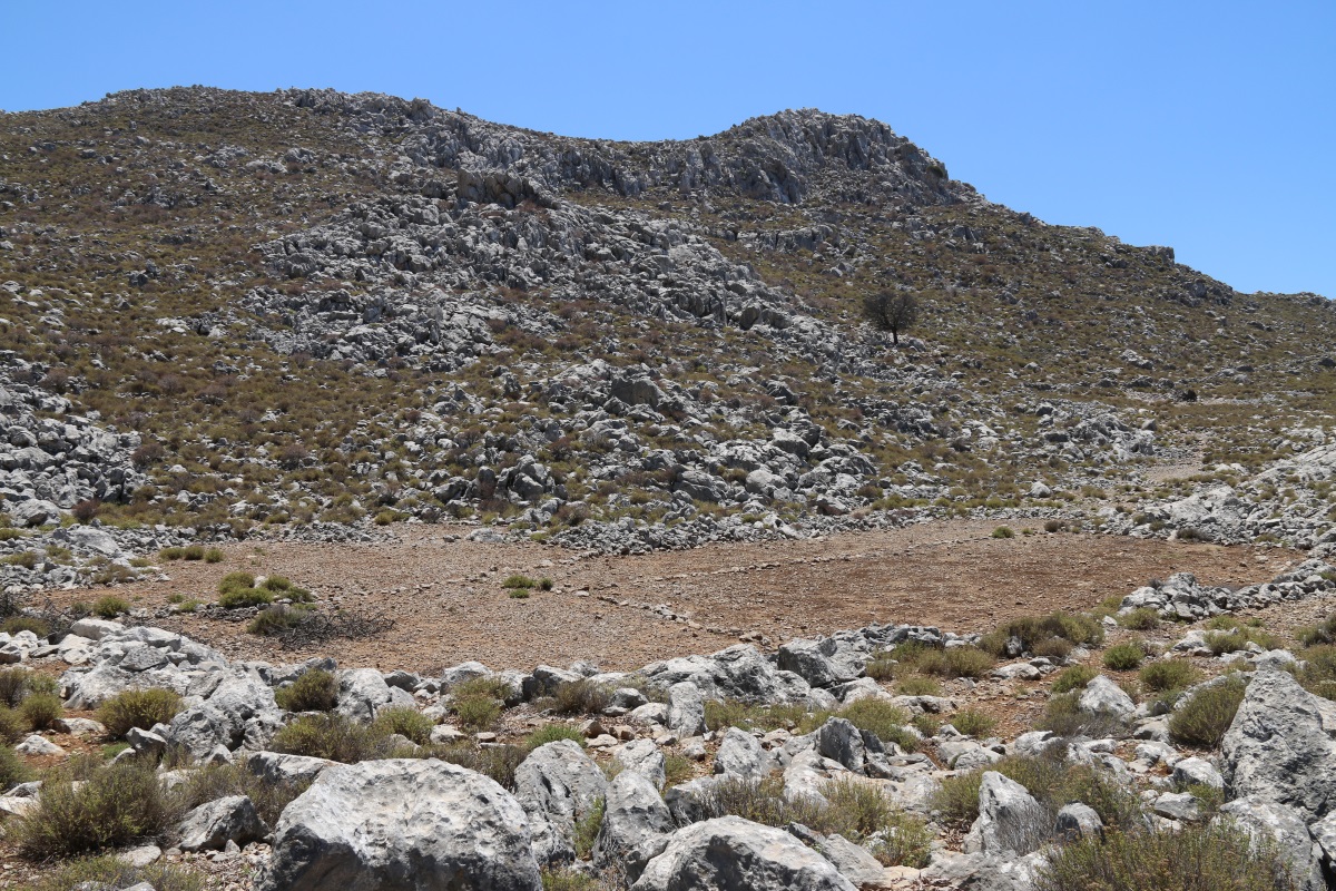 It is indeed an old enclosure. From the route I had taken along the valley floor it looked like just another jumble of rocks and broken down terraces but looking explicitly for it there is a clear trodden path over the rocks with a large marker stone. Walk around the perimeter and the enclosure is just as it appears on the satellite image. One large, concentrated heap of collapsed stones in a circular shape may be an old dwelling, or not.