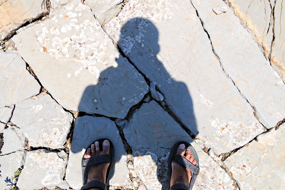 From the top the route follows bits of goat path to the other end of the ridge, pausing on the way at a ridge-top threshing circle at noon to celebrate the solstice with the customary photo of the shortest me, my shadow shrunken by the now near-overhead sun.