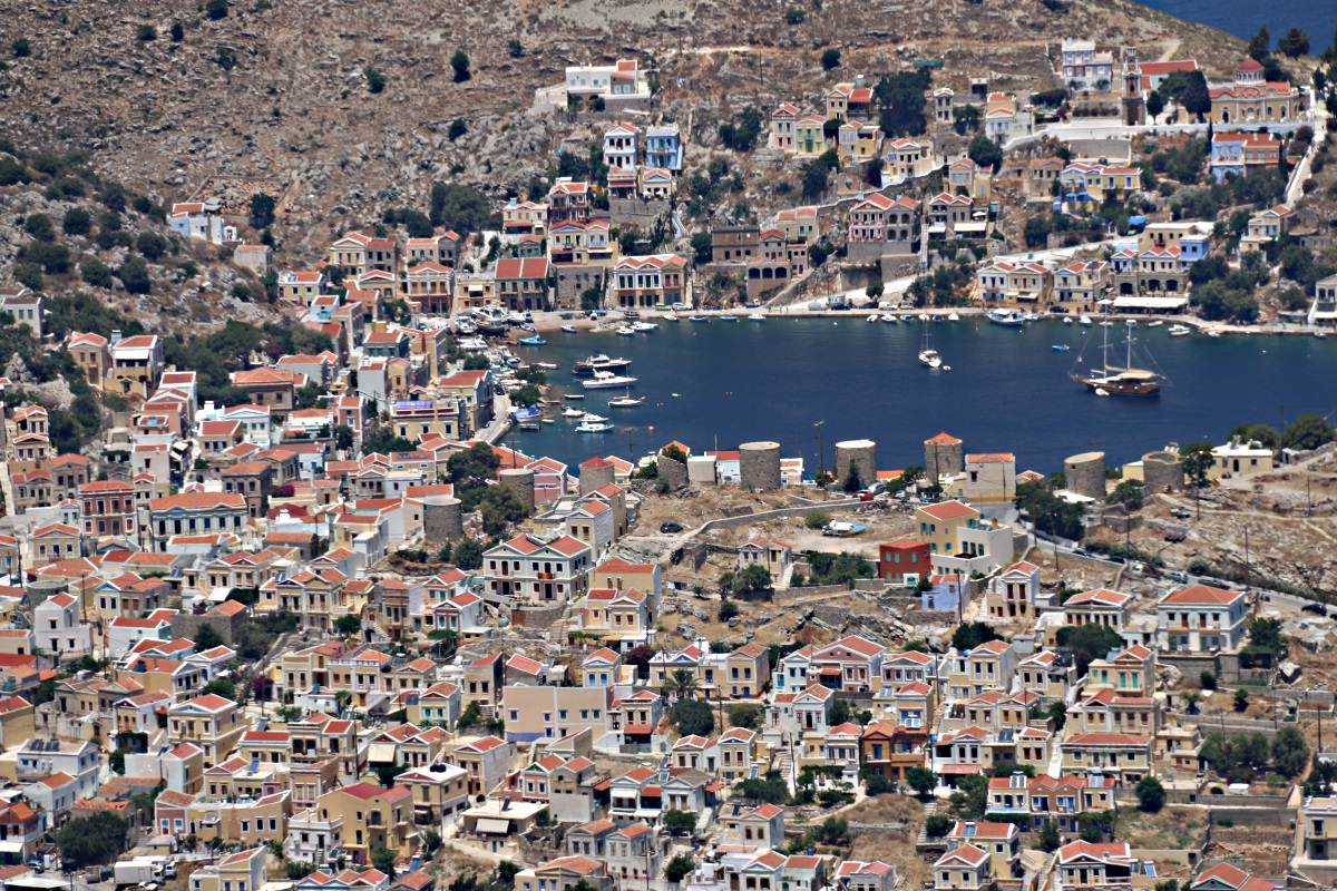 Mind whirling with possible explanations for the enclosure I had been looking at, on the way back to the town I stopped off for a swim in Nimborio Bay before going over the shoulder of the hill back to the harbour. Not very far away but out of sight, it may be that the settlement had been related to Nimborio, the name a corruption of ‘Emborios’ which is a widespread name in Greece for a trading or market place. It’s the root of the English word ‘Emporium’. Apparently Nimborio was the main settlement on Symi long before the current harbour was developed. That would make sense because the shore at the head of the bay is gently shelving so boats could have been more easily beached and dragged out of the water compared with the fjord-like main harbour now.