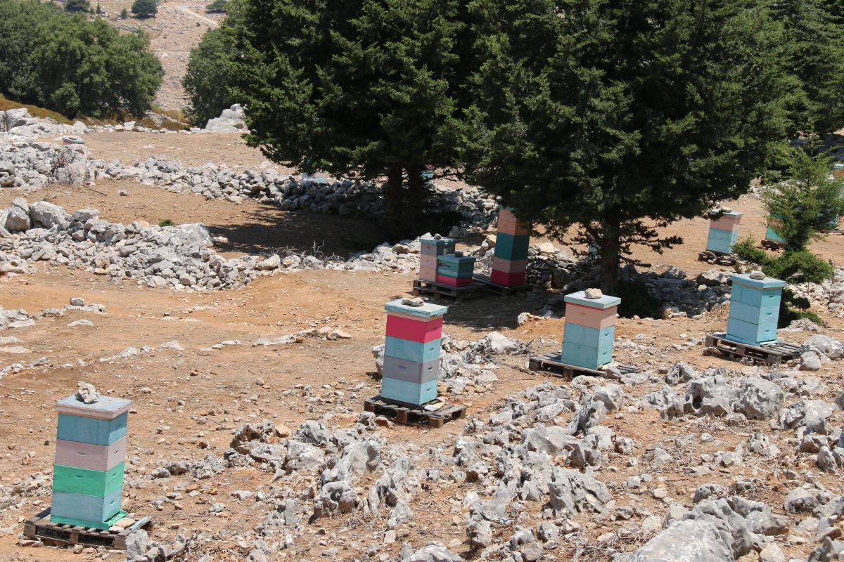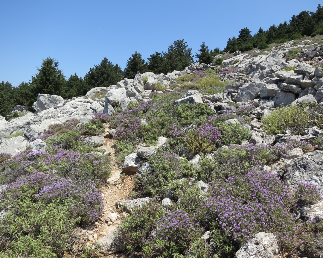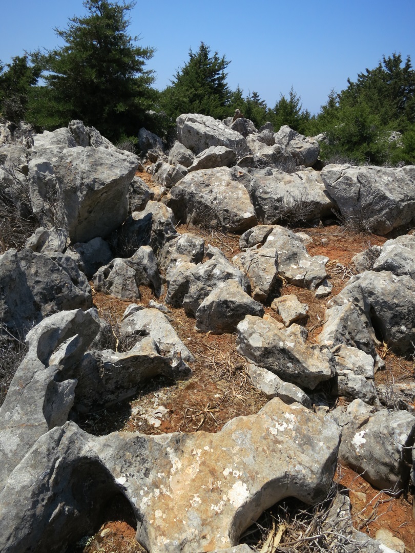 At the end of the cypress woodland on the left, leave the path (stay on it for an easier option) and drop straight down the mountainside. It’s rough underfoot but easy to pick a way between and over the rocks. I took a line to go to the left of the 30 or so beehives – I’m a wimp, I don’t fancy being attacked by trillions of nectar-laden bees en route to drop off the day’s produce. Even so, scouts were sent out to buzz me and warn me off. They followed me until I was well out of sight of the hives. I’m not making this up!!!