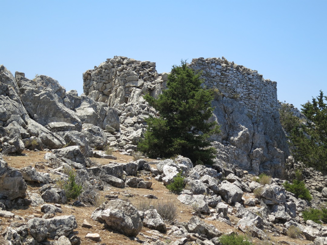 It’s slow going between rocks and low vegetation. Reading the ground as the path meanders through limestone rocks sculpted by solution erosion is easy, if you know what you are doing, and the occasional marker confirms the right line. Next target is the ridge-top Lappatoniou Castle. It’s not an impressive structure compared to the massive fortress on Nisyros dating back to some say to two millennia BC, or the Crusader castles on Rhodes or Halki, but it’s a very dramatic location.
