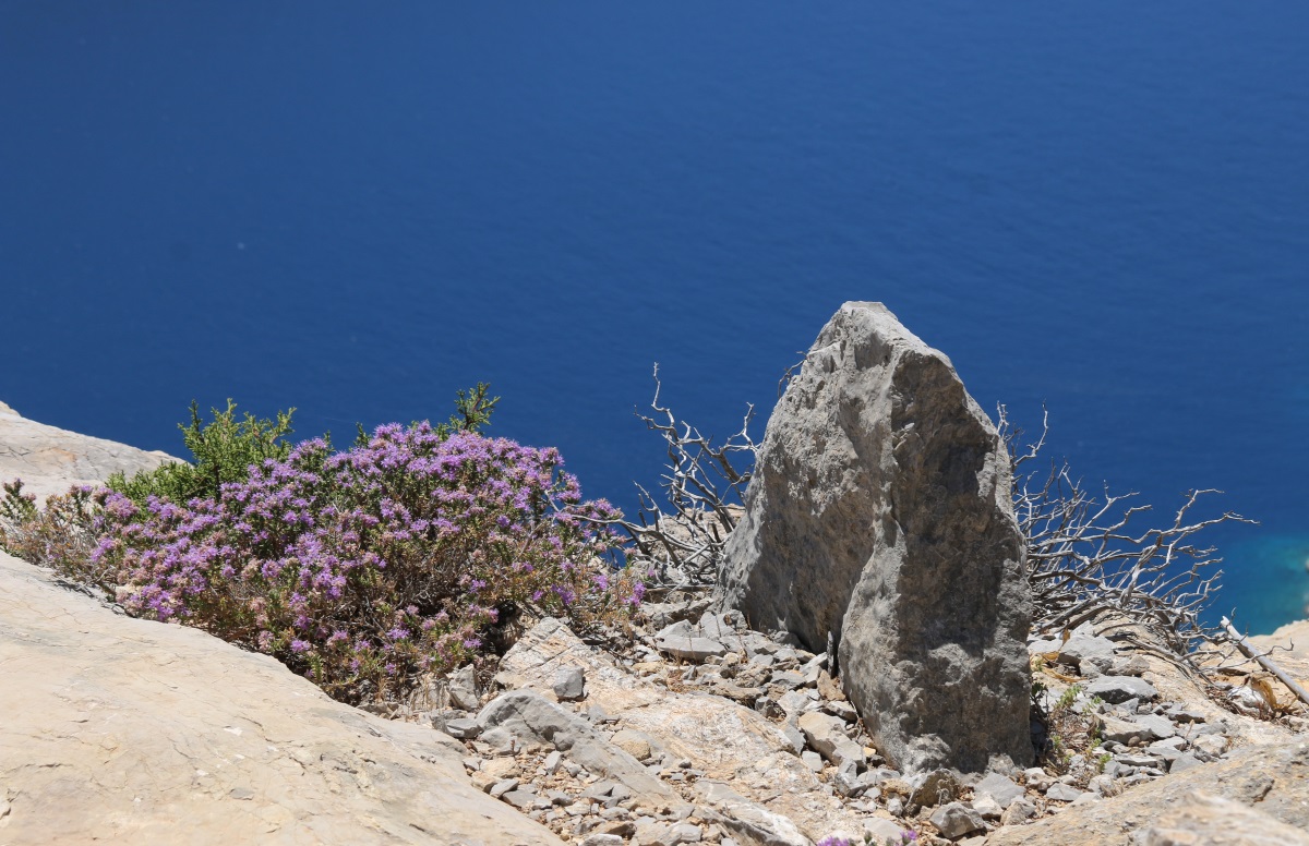 From there it’s on a very thin path marked strategically with vertical stone-on-rock markers. The problem at the end of June is that the thyme is in full flower along here and the air is full of buzzing …. and bees. I’m not a nervous walker by any stretch of the imagination, but this section had me on edge the whole time. I must have accidentally kicked one, maybe two, which stung me in rapid succession on both ankles. Little b….ds!!!
