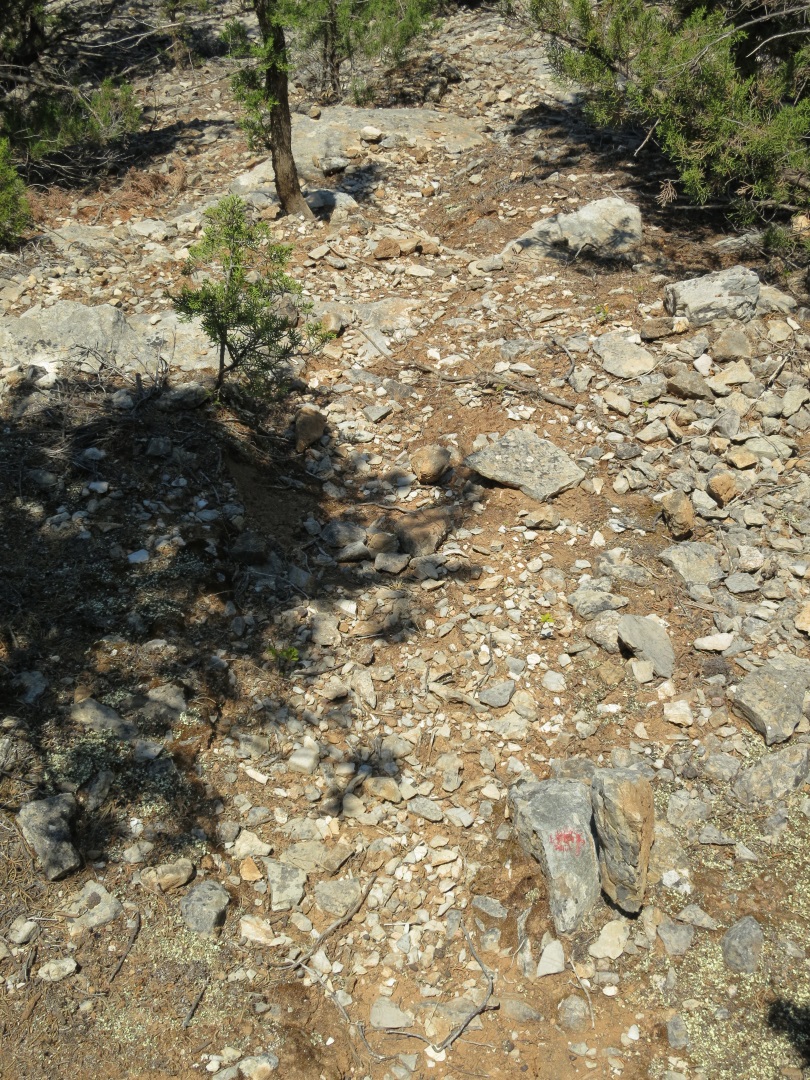 Yes, this is the path down through the cypress woodland, simple vertical stone marker next to faded red dot at bottom right