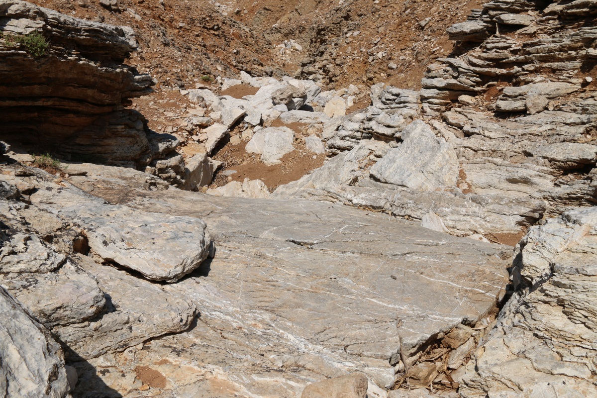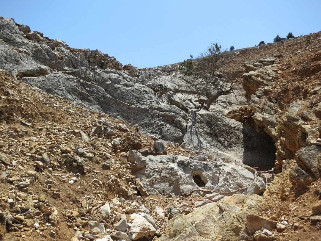 It was at the top of a long sloping slab that I discovered I had lost my shirt. I always carry a spare clean T-shirt in case I end up somewhere respectable or go into a taverna for a frappé at the end of the walk. I stopped to take a selfie of me framed in a narrow gap by placing the camera on a purpose-made beanbag on top of the spare shirt on a rock and using a remote control … and the shirt wasn’t there. I remembered taking it out at the Ioannis Theologos monastery when I stopped for a swig of water in the shade and forgot to put it back. No real problem, just irritation at my carelessness.