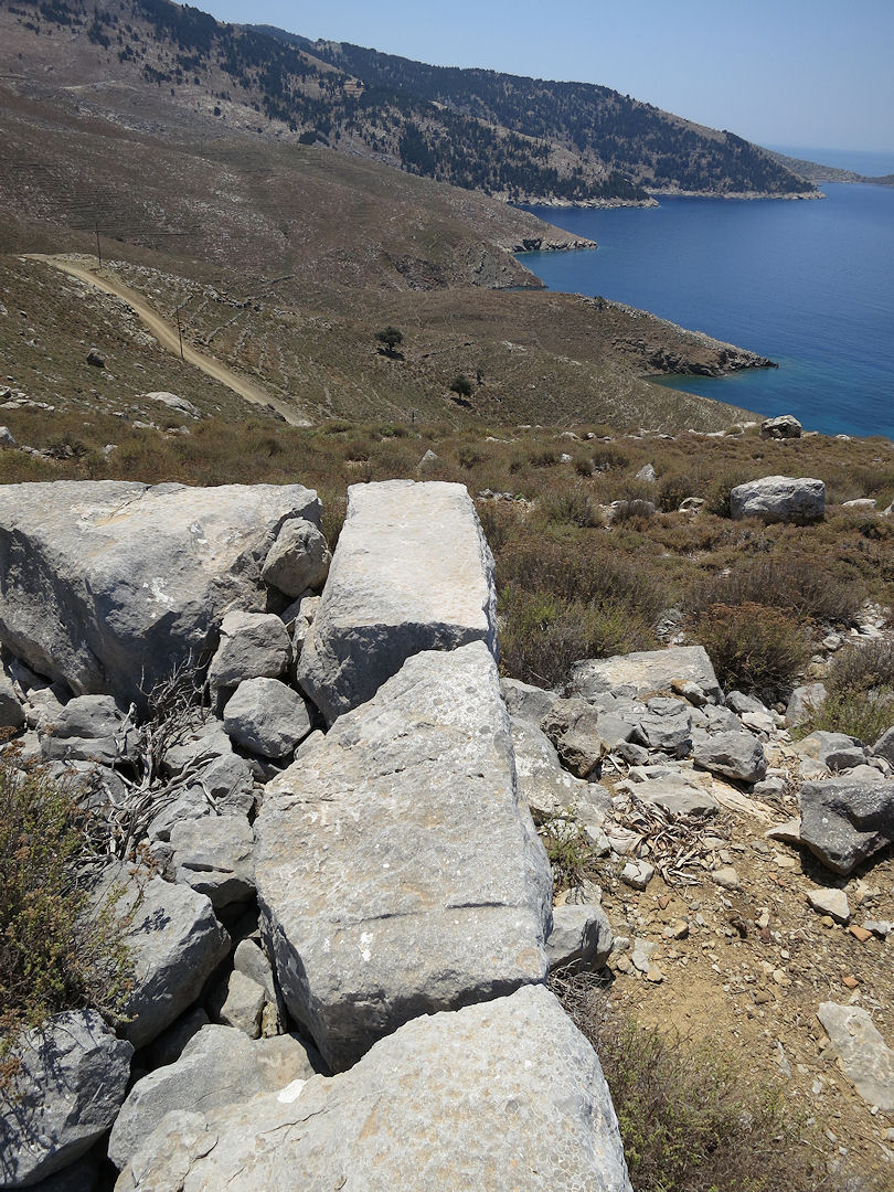 It’s not marked on any map but I’ve called it that because on one map the area is marked as ‘Katana’ and the construction is similar to castle construction elsewhere on Symi and other Islands in the Dodecanese.  Located on the rim of the Hidden Valley it looks down to Toli and the ‘Classical Period Ruins’ which I explored last year (view) and which also has walls built out of massive dressed stones.  There are the vestiges of an ancient path reached by climbing up the earth bank from the track bulldozed down to Toli but it is very steep and rough.  I suspect it is now an alternative but less used route taken by migrating goats.