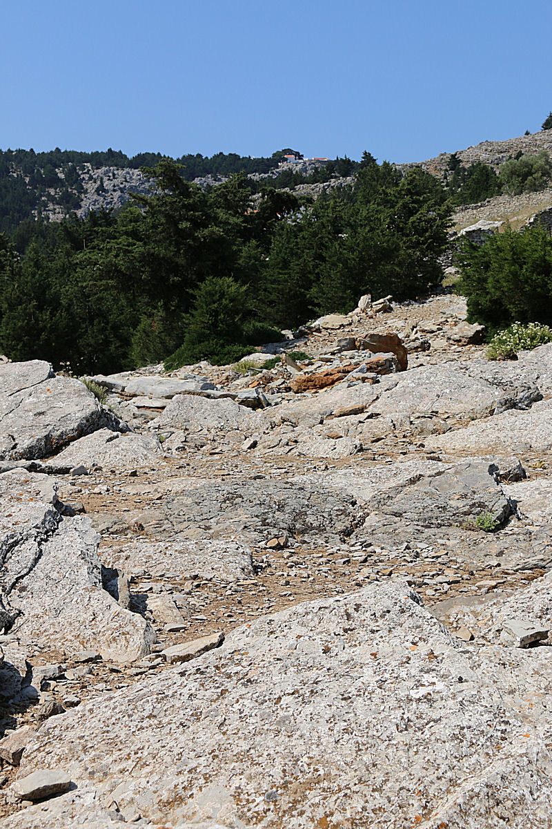 An old kalderimi zig-zags up the northern face of the Pyrgalia ridge from the top end of Horio to old and now derelict buildings before becoming a footpath climbing up rock outcrops to reach the top.  It reaches the ridge-top mid-way along its length at a stone threshing circle behind the monastery of Panagia Hamon.   From here the view north is straight down into the harbour 430 metres below and south to the mountain top monastery of the Archangel Mihail Kokkimidis.