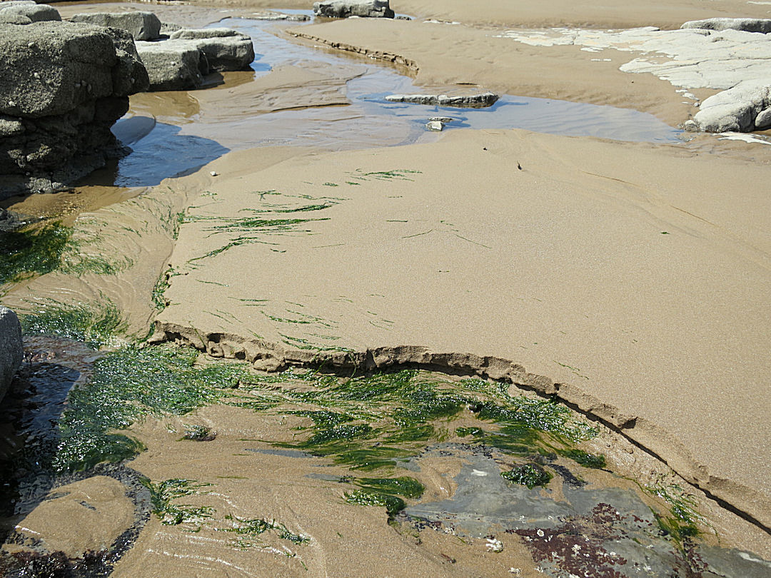 In places where water draining from pools joins with spring water from the cliffs semi-permanent streams are formed, scouring channels in the freshly deposited sand after every high tide