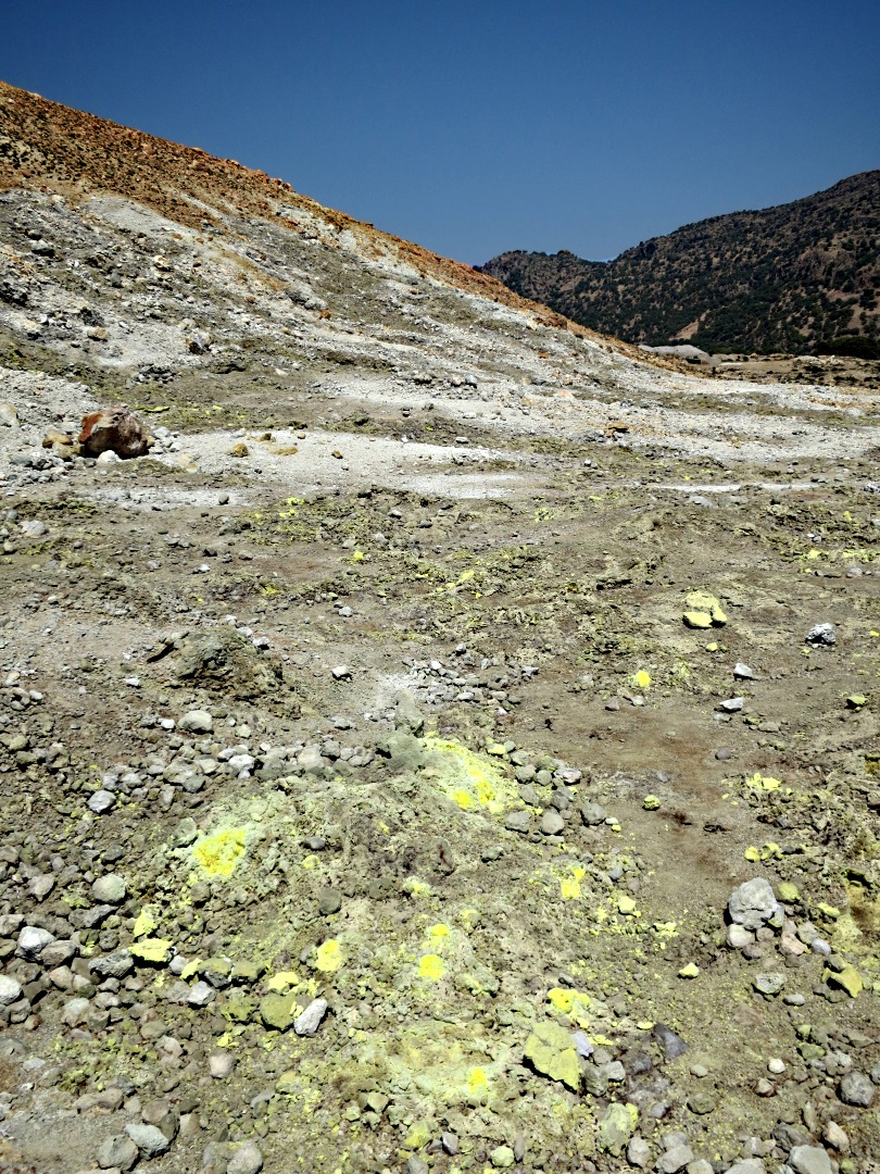 The cone of a small crater patterned by brilliant yellow sulphur. The eye can adjust for the contrast, my technical skill as a photographer can’t.