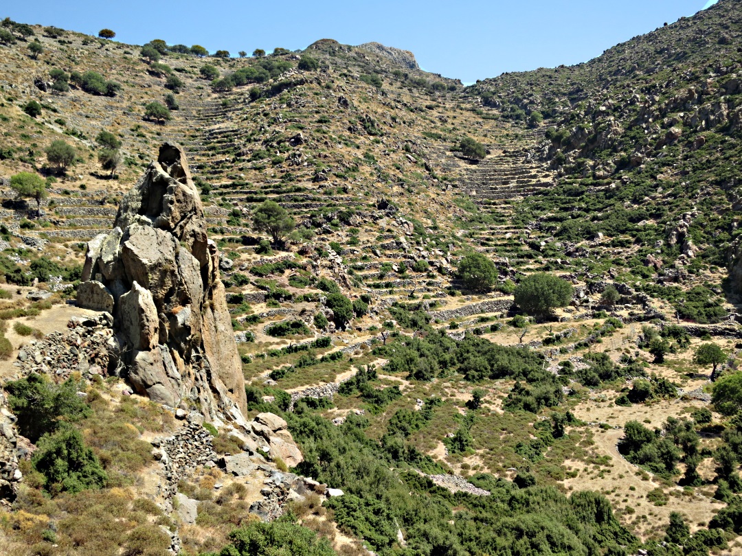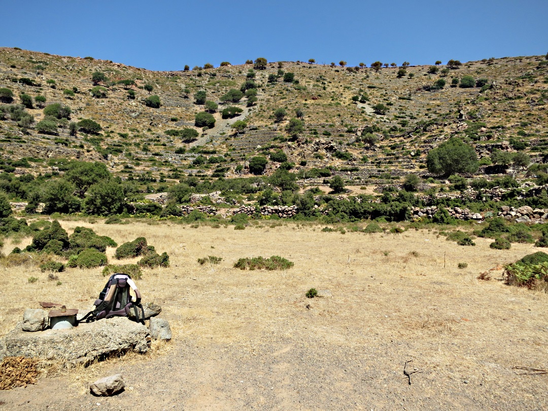 At 170 metres ASL, the lowest point of the Kato Laki crater, internal draining and rising on all sides with narrow stone built terraces each between 2 and 3 metres high all the way to the rim
