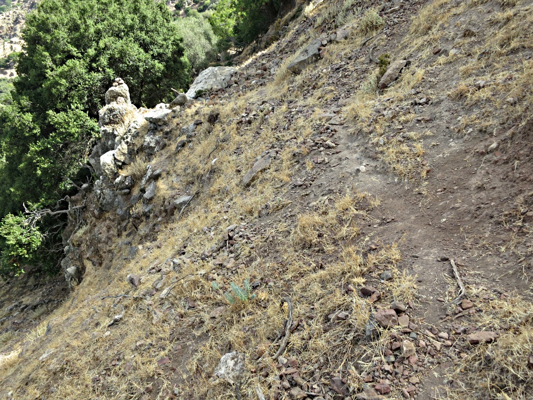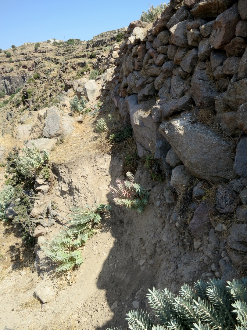 Losing itself in a small cluster of ancient dwellings and terraces the path eventually re-emerges rising gently and easily until it is taken out by a small landslide as the retaining wall below to the left has collapsed.  It is possible to scramble down and across but as a climber and with a personal principle that, unless there is no choice, I don’t go down if I have to go back up again, I traversed above the collapse using small hand and foot holds in the terrace wall above.  One of these days I’ll come a cropper but thankfully not this trip.