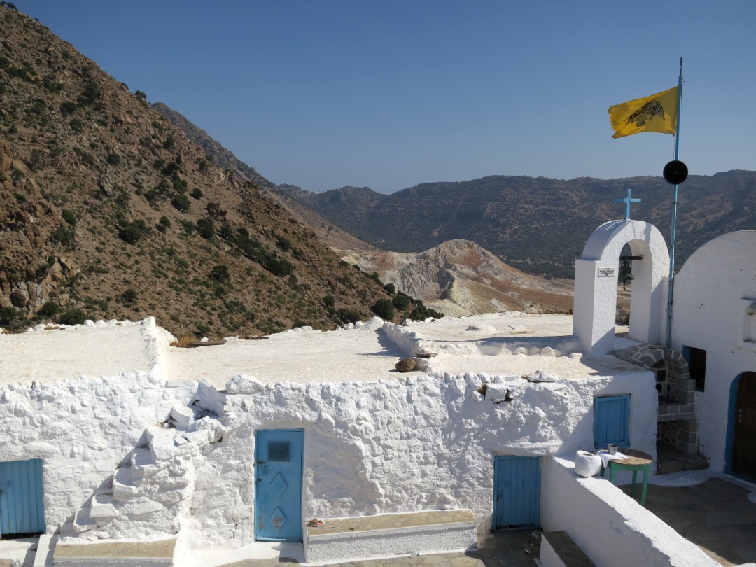 View across the courtyard of Agios Stavros monastery, the top of the Alexandros crater just beyond, Stephanos out of sight below