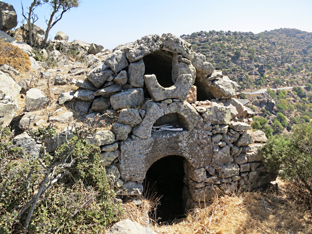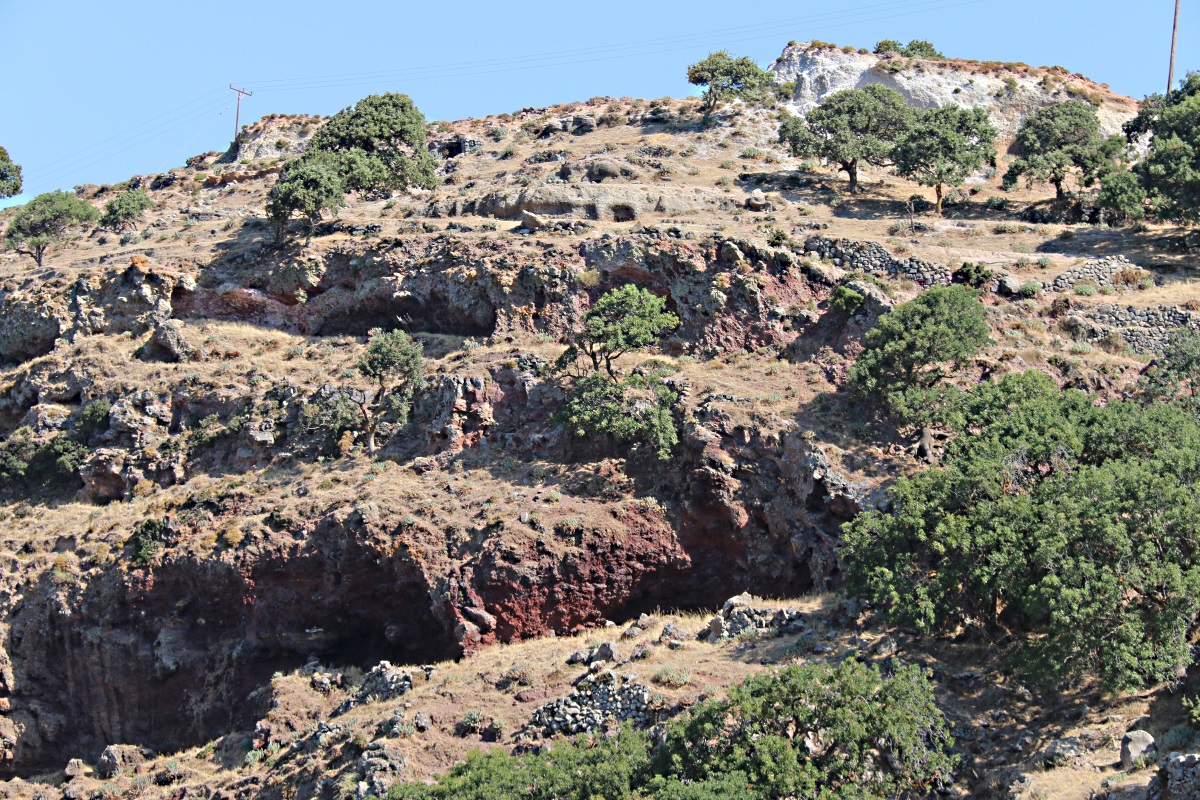 This path leads to a stone-paved kalderimi zigzagging 200 metres up to Nikia, passing jagged lava outcrops and ancient barrel-arched houses built into the rocks and under agricultural terraces.