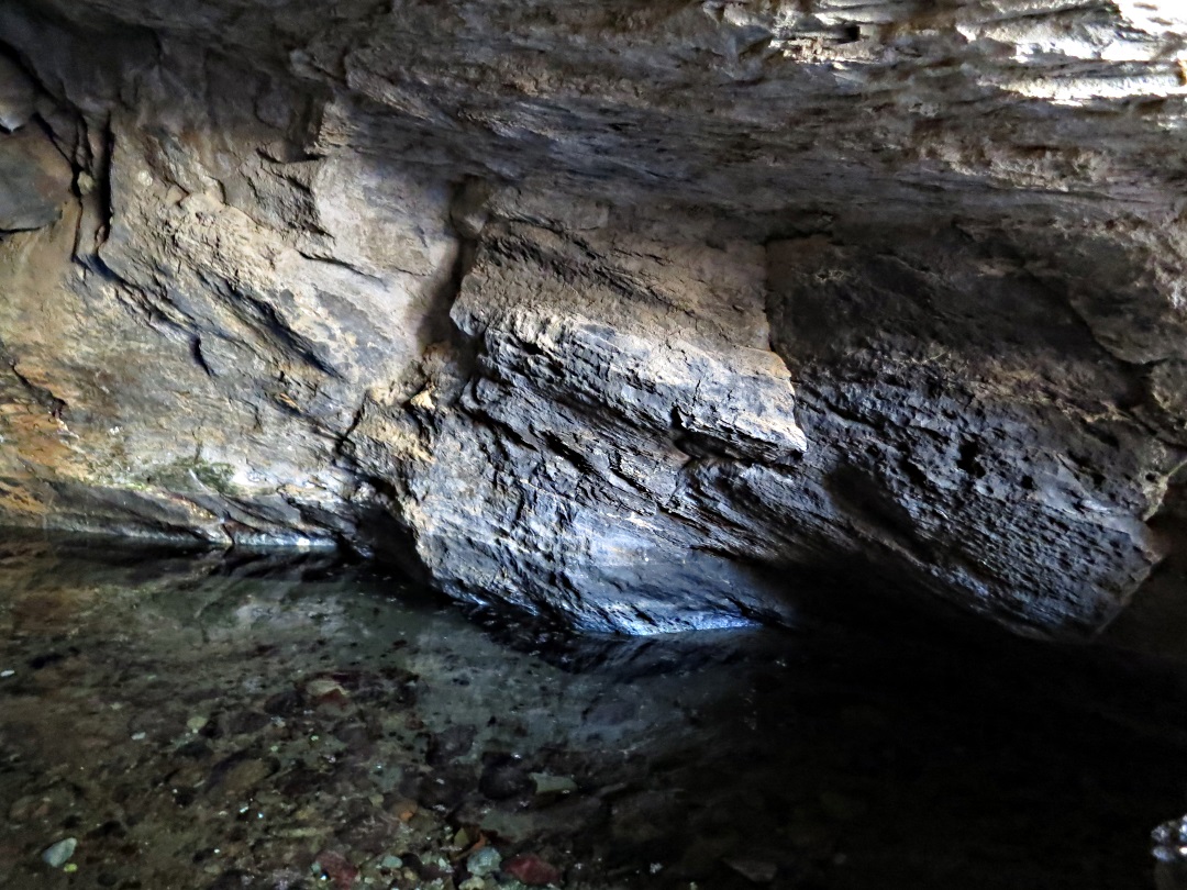 The underground church with the remnant of the arched terracotta roof and the cave with the thermal spring in the background