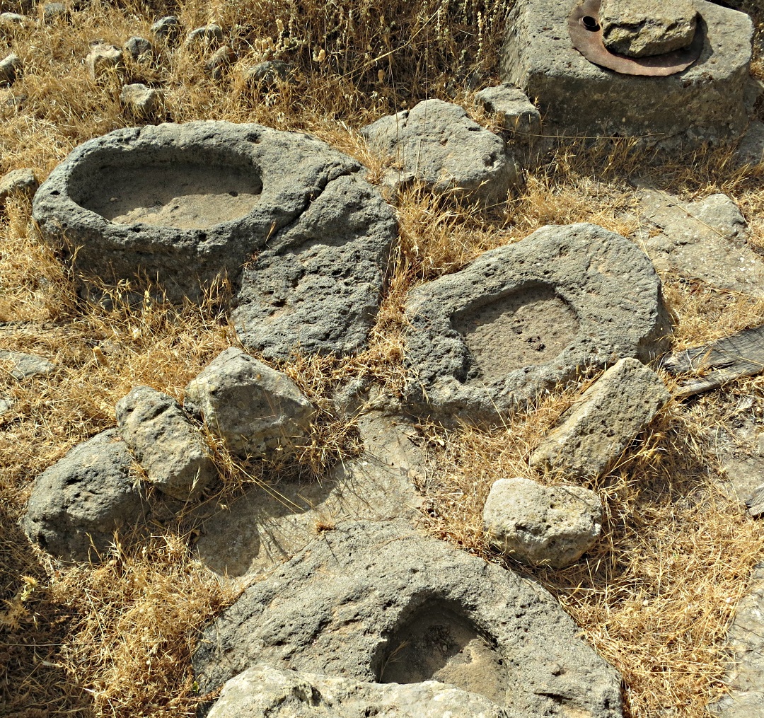 While dropping down the paved and recently maintained kalderimi from Emborios to the caldera floor, a stone cistern-top and carved stone bowl indicate nearby houses