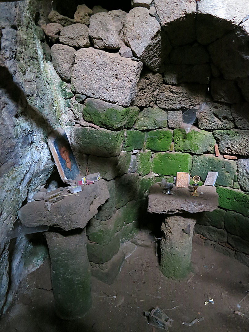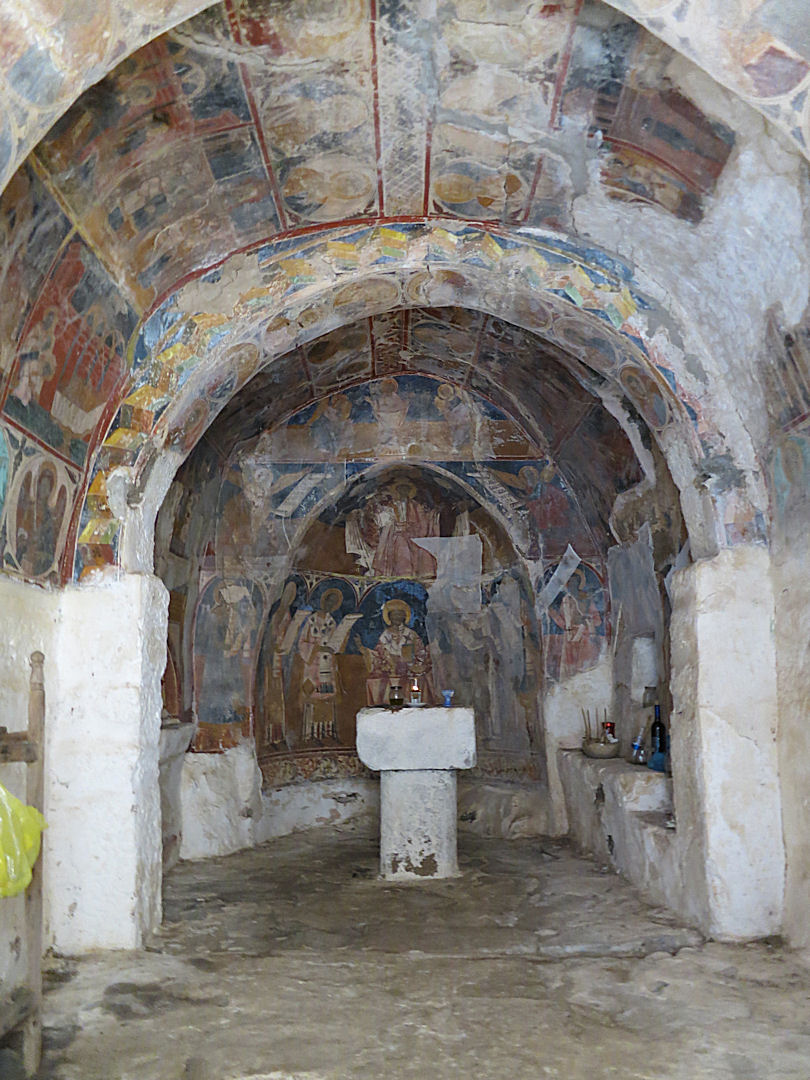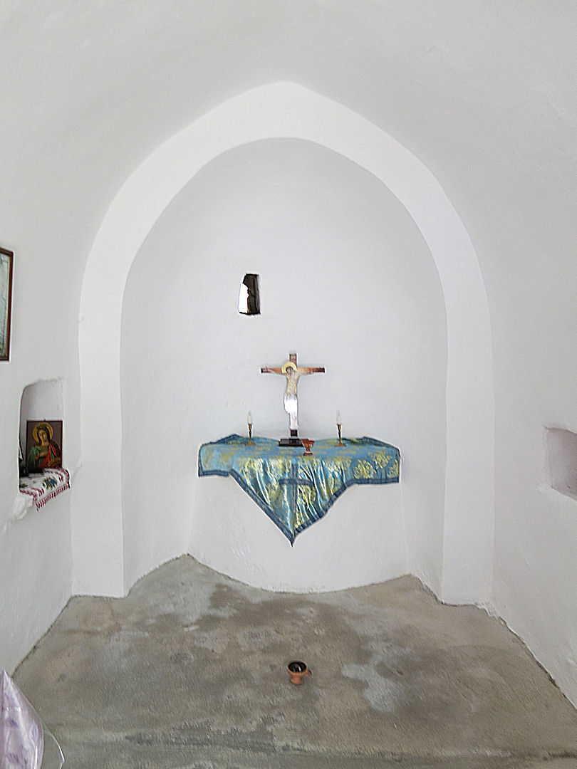 At the top of the col between the main caldera and the Evangelistra monastery, climb over unstable rocks to three dwellings almost completely hidden and at the back is a small ‘chapel’ with a shard of sculpted marble on a small altar.