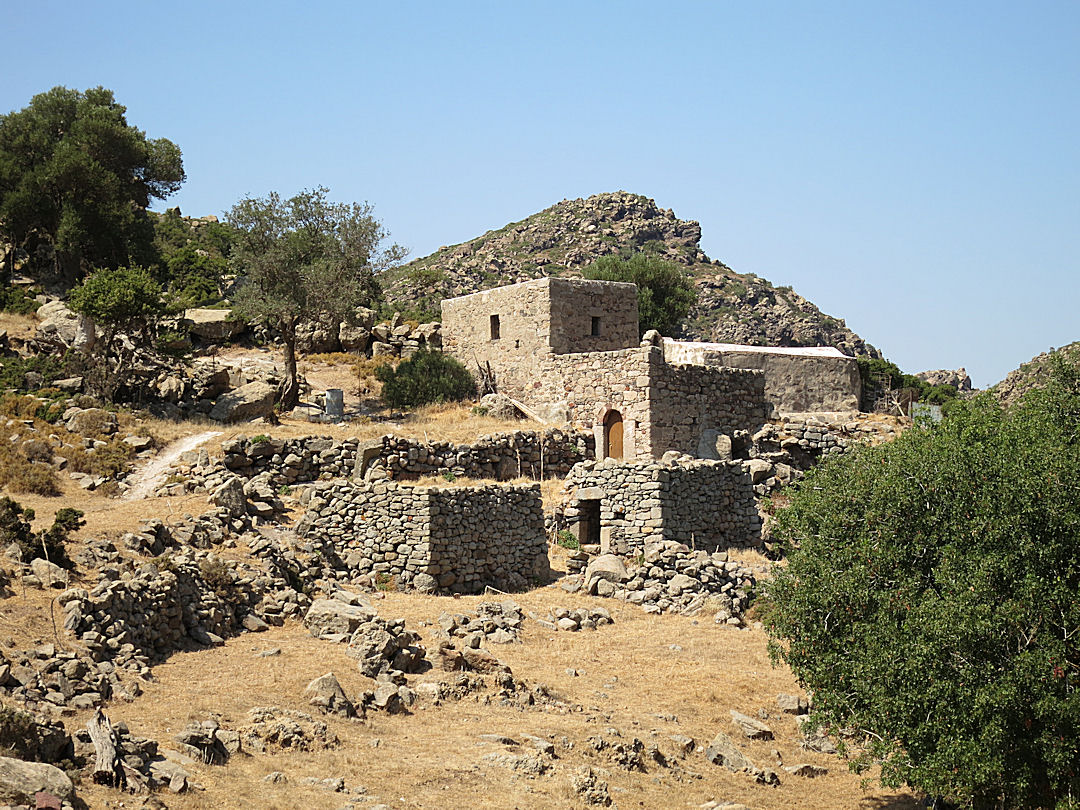 In addition to the very many secular dwellings there are also small monastic complexes notably Siones and Armas.  Though considerably smaller than the ‘fortress’ monasteries such as Megalos Sortiris, Panagia Panaiidi and Roukouniotis on Symi, they are contained within high stone walls in contrast with the low walls of the purely agricultural farmsteads.  Inside both Siones and Armas an original cave has been supplemented by family accommodation and a chapel.
