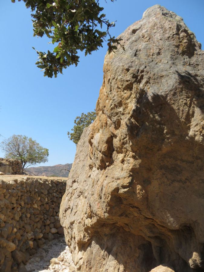 The path, now a stream-bed squeezed between stone wall and huge boulder