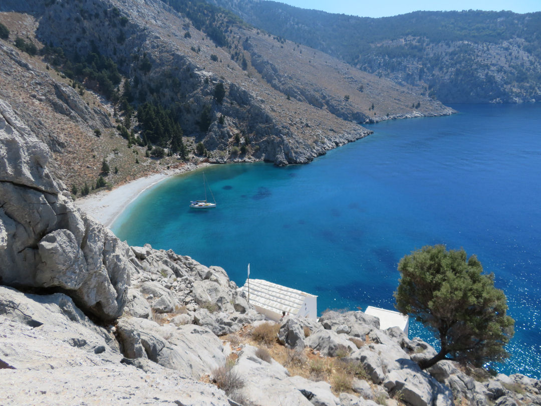More walks when friends came from the UK. To the ridge-top then down to Nimborio via the gorge, gouged out and scoured by The Flood a couple of years ago. To the deserted village of Gria via the monastery of Zoodohou Vrisi with warning of contamination of the water supply by rats. Agios Vasilios and Lapathos Beach with the last drop down the cliff with less scree than usual. Agia Marina and back via Pedi and the valley path to Horio.