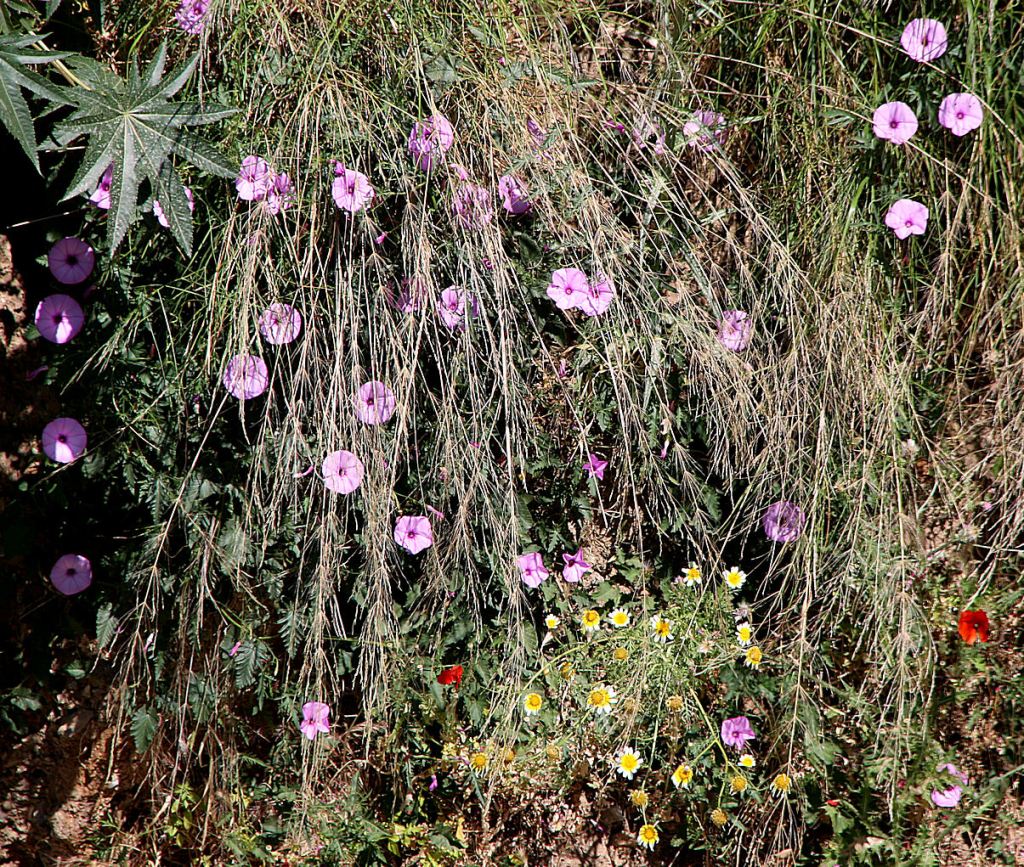 A pleasant surprise was that though the fields swathed in Crown Daises (Glebionis coronaria) swaying in the breeze had finished flowering, there were still many smaller spots of colour in the rapidly crisping vegetation, juices sucked out by the sun and the wind. Each plant driven by its own solution to the battle for survival, seeds swelling and dropped or wafted away, ready for the autumn rains and the next progeny.